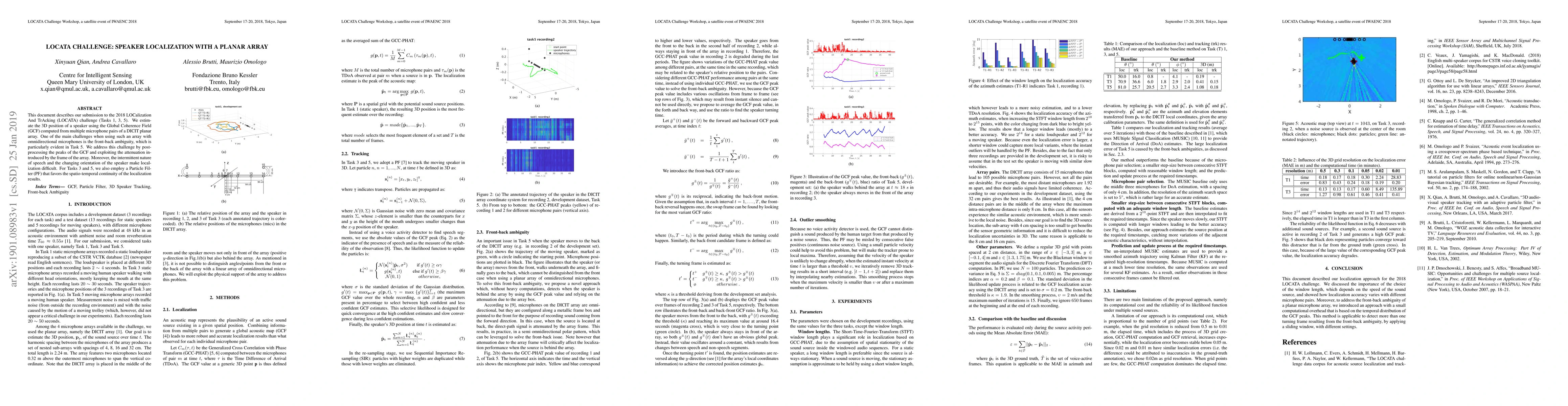 This document describes our submission to the 2018 LOCalization And TrAcking (LOCATA) challenge (Tasks 1, 3, 5). We estimate the 3D position of a speaker using the Global Coherence Field (GCF) computed from multiple microphone pairs of a DICIT planar array. One of the main challenges when using such an array with omnidirectional microphones is the front-back ambiguity, which is particularly evident in Task 5. We address this challenge by post-processing the peaks of the GCF and exploiting the attenuation introduced by the frame of the array. Moreover, the intermittent nature of speech and the changing orientation of the speaker make localization difficult. For Tasks 3 and 5, we also employ a Particle Filter (PF) that favors the spatio-temporal continuity of the localization results.