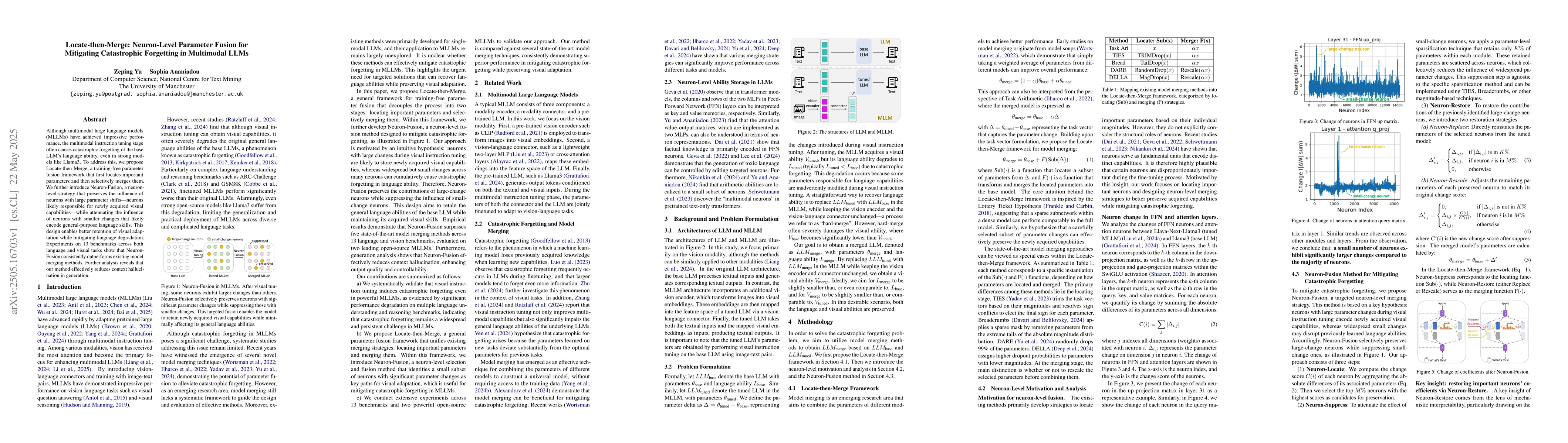 A new method called Locate-then-Merge helps multimodal LLMs retain their language ability while adapting to visual tasks, reducing catastrophic forgetting and improving performance on 13 benchmarks.