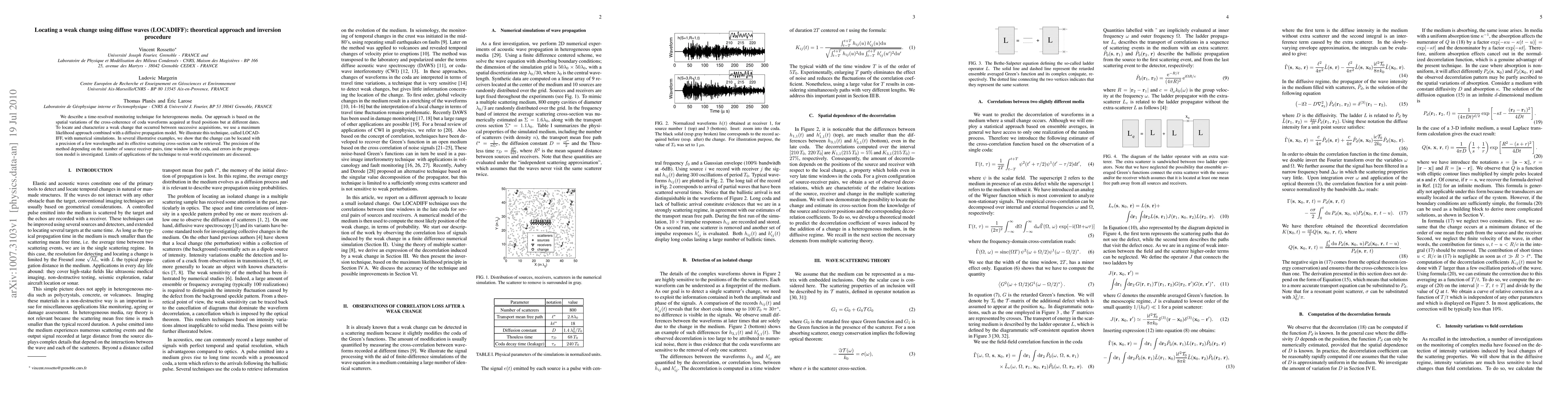 We describe a time-resolved monitoring technique for heterogeneous media. Our approach is based on the spatial variations of the cross-coherence of coda waveforms acquired at fixed positions but at different dates. To locate and characterize a weak change that occurred between successive acquisitions, we use a maximum likelihood approach combined with a diffusive propagation model. We illustrate this technique, called LOCADIFF, with numerical simulations. In several illustrative examples, we show that the change can be located with a precision of a few wavelengths and its effective scattering cross-section can be retrieved. The precision of the method depending on the number of source receiver pairs, time window in the coda, and errors in the propagation model is investigated. Limits of applications of the technique to real-world experiments are discussed.