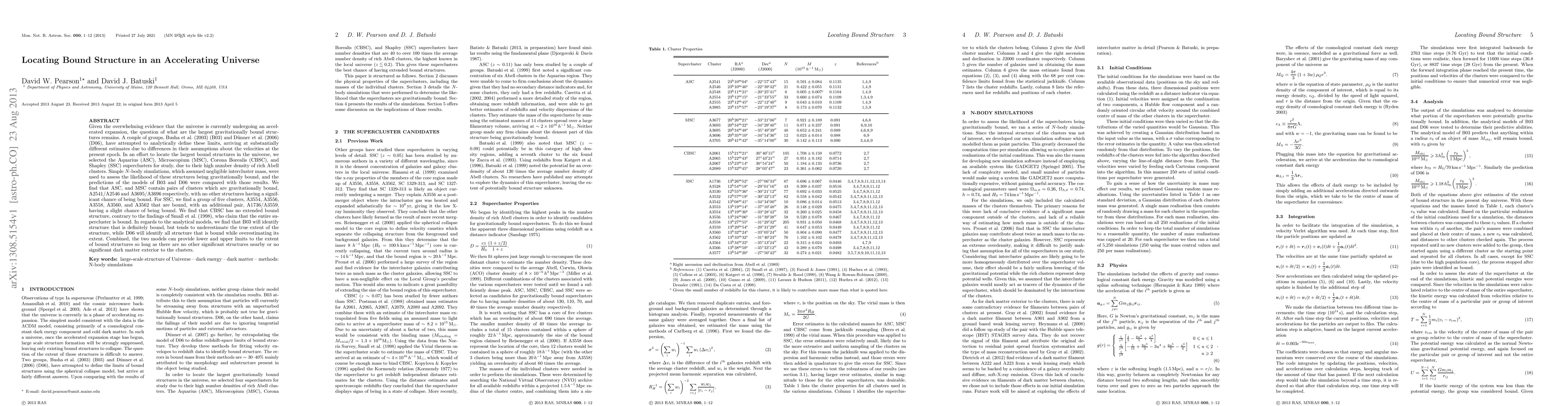 Given the overwhelming evidence that the universe is currently undergoing an accelerated expansion, the question of what are the largest gravitationally bound structures remains. A couple of groups, Busha et al. 2003 (B03) and Dunner et al. 2006 (D06), have attempted to analytically define these limits, arriving at substantially different estimates due to differences in their assumptions about the velocities at the present epoch. In an effort to locate the largest bound structures in the universe, we selected the Aquarius (ASC), Microscopium (MSC), Corona Borealis (CBSC), and Shapley (SSC) superclusters for study, due to their high number density of rich Abell clusters. Simple N-body simulations, which assumed negligible intercluster mass, were used to assess the likelihood of these structures being gravitationally bound, and the predictions of the models of B03 and D06 were compared with those results. We find that ASC, and MSC contain pairs of clusters which are gravitationally bound, A2541/A2546 and A3695/A3696 respectively, with no other structures having a significant chance of being bound. For SSC, we find a group of five clusters, A3554, A3556, A3558, A3560, and A3562 that are bound, with an additional pair, A1736/A3559, having a slight chance of being bound. We find that CBSC has no extended bound structure, contrary to the findings of Small et al. 1998, who claim that the entire supercluster is bound. In regards to the analytical models, we find that B03 will identify structure that is definitely bound, but tends to underestimate the true extent of the structure, while D06 will identify all structure that is bound while overestimating its extent. Combined, the two models can provide lower and upper limits to the extent of bound structures so long as there are no other significant structures nearby or no significant dark matter exterior to the clusters.
