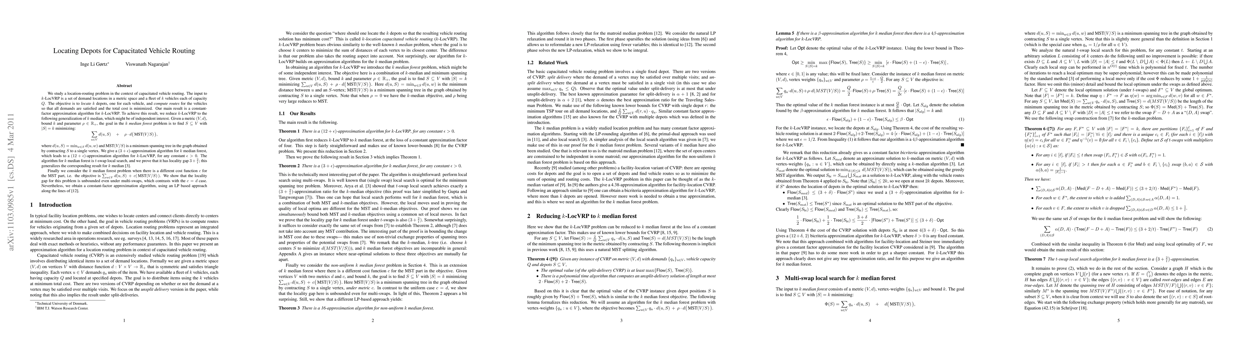 This paper presents a constant-factor approximation algorithm for locating depots and computing routes for capacitated vehicles to satisfy demands while minimizing total cost. The authors reduce the problem to a k-median-forest problem, achieving a (3+c)-approximation for the former, and demonstrate that the algorithm's locality gap generalizes known results for k-median.