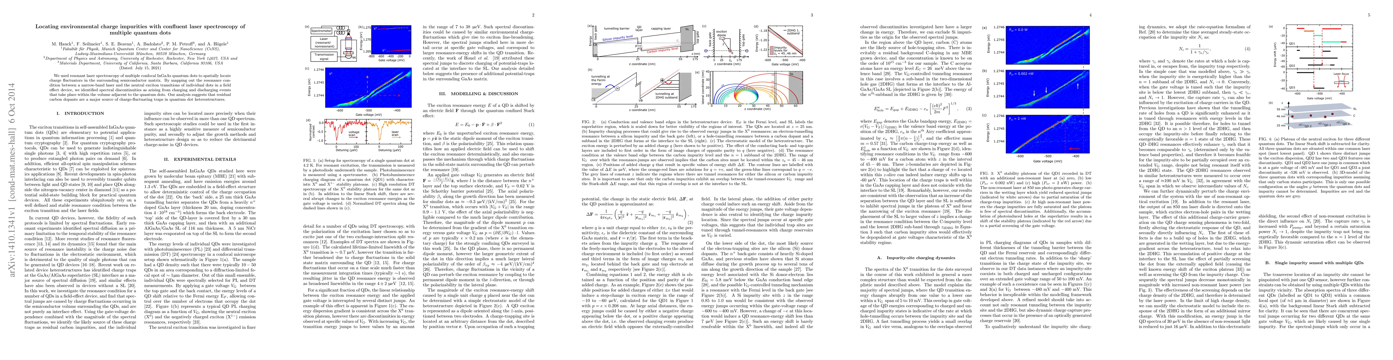 We used resonant laser spectroscopy of multiple confocal InGaAs quantum dots to spatially locate charge fluctuators in the surrounding semiconductor matrix. By mapping out the resonance condition between a narrow-band laser and the neutral exciton transitions of individual dots in a field effect device, we identified spectral discontinuities as arising from charging and discharging events that take place within the volume adjacent to the quantum dots. Our analysis suggests that residual carbon dopants are a major source of charge-fluctuating traps in quantum dot heterostructures.