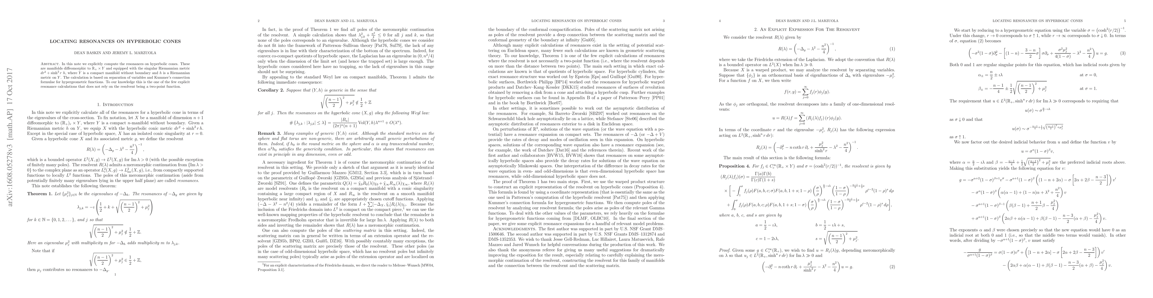 Researchers have made an explicit calculation of resonances on hyperbolic cones using separation of variables and Kummer's connection formulae, providing a unique insight into the behavior of these complex manifolds.