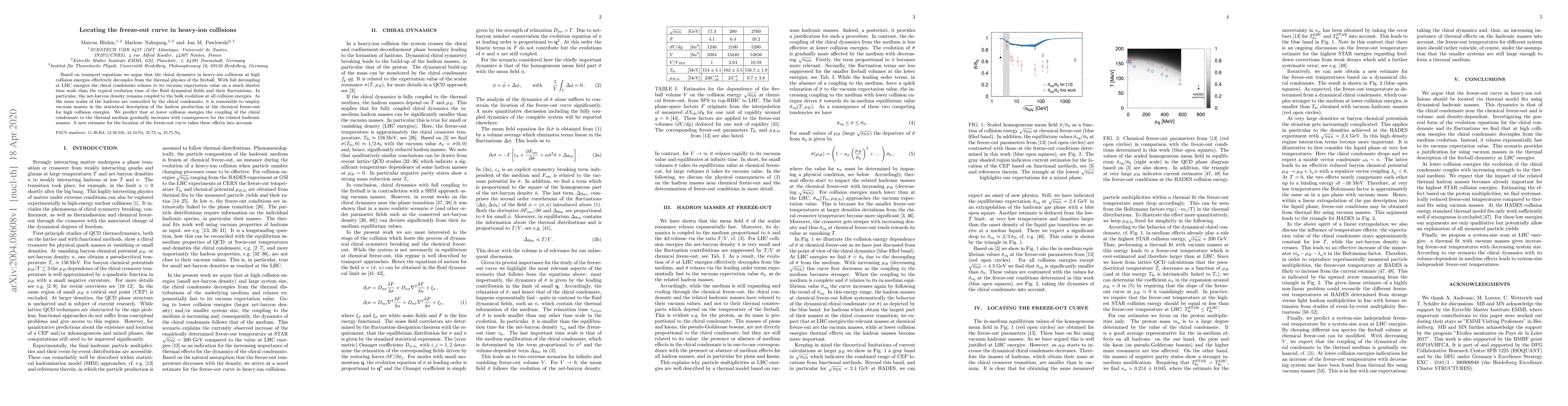 Based on transport equations we argue that the chiral dynamics in heavy-ion collisions at high collision energies effectively decouples from the thermal physics of the fireball. With full decoupling at LHC energies the chiral condensate relaxes to its vacuum expectation value on a much shorter time scale than the typical evolution time of the fluid dynamical fields and their fluctuations. In particular, the net-baryon density remains coupled to the bulk evolution at all collision energies. As the mass scales of the hadrons are controlled by the chiral condensate, it is reasonable to employ vacuum masses in the statistical description of the hadron production at the chemical freeze-out for high collision energies. We predict that at lower collision energies the coupling of the chiral condensate to the thermal medium gradually increases with consequences for the related hadronic masses. A new estimate for the location of the freeze-out curve takes these effects into account.