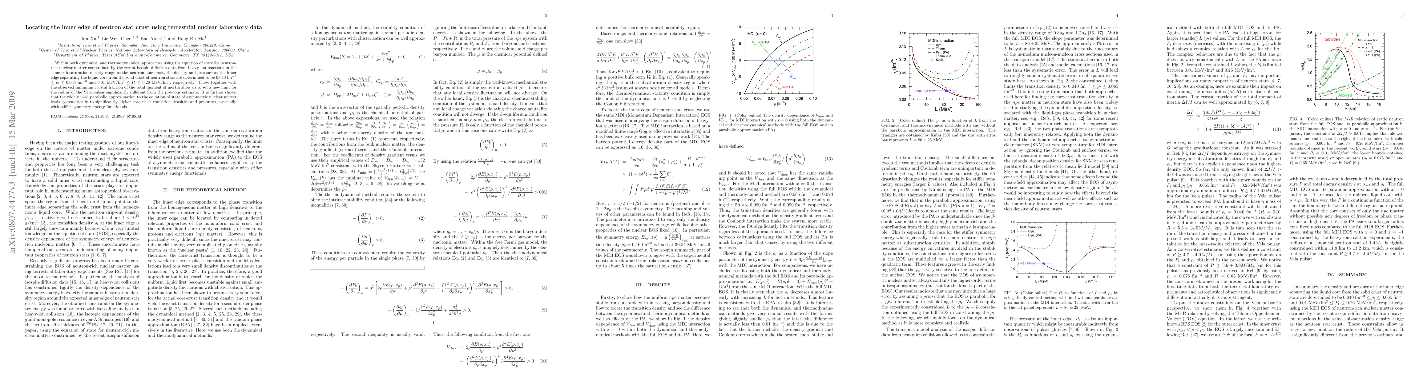 This paper determines the inner edge of neutron star crust density and pressure using terrestrial nuclear laboratory data, finding 0.040 fm$^{-3}$ $\leq \rho_{t}\leq 0.065$ fm$^{-3}$ and 0.01 MeV/fm$^{3} \leq P_{t}\leq 0.26$ MeV/fm$^{3}$. It also revises the radius of the Vela pulsar and critiques the parabolic approximation for the equation of state.