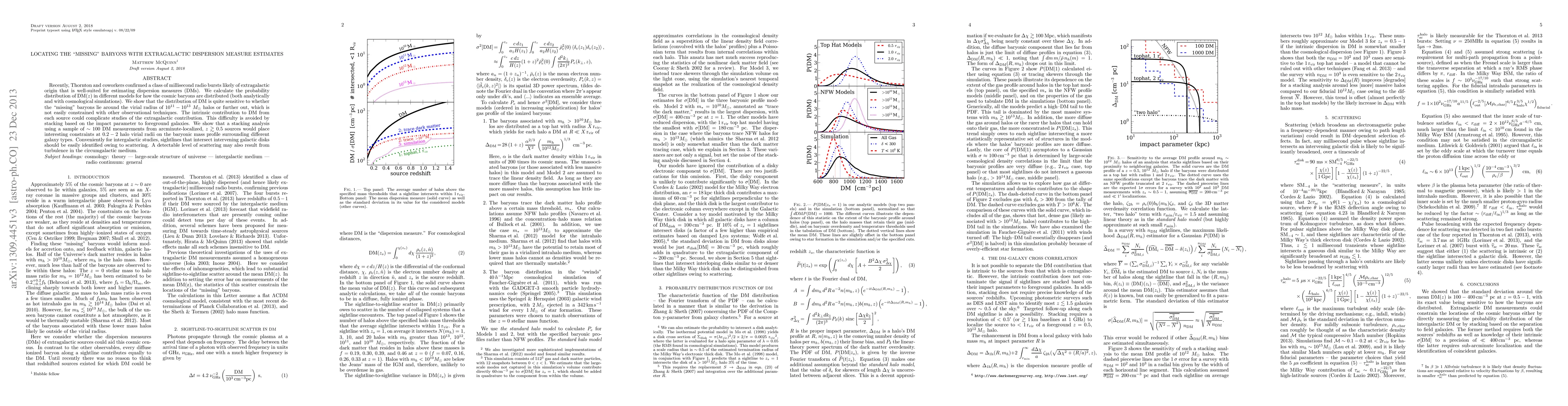 Recently, Thornton and coworkers (2013) confirmed a class of millisecond radio bursts likely of extragalactic origin that is well-suited for estimating dispersion measures (DMs). We calculate the probability distribution of DM(z) in different models for how the cosmic baryons are distributed (both analytically and with cosmological simulations). We show that the distribution of DM is quite sensitive to whether the "missing" baryons lie around the virial radius of 10^11-10^13 Msun halos or further out, which is not easily constrained with other observational techniques. The intrinsic contribution to DM from each source could complicate studies of the extragalactic contribution. This difficulty is avoided by stacking based on the impact parameter to foreground galaxies. We show that a stacking analysis using a sample of ~100 DM measurements from arcminute-localized, z >~ 0.5 sources would place interesting constraints at 0.2-2 halo virial radii on the baryonic mass profile surrounding different galaxy types. Conveniently for intergalactic studies, sightlines that intersect intervening galactic disks should be easily identified owing to scattering. A detectable level of scattering may also result from turbulence in the circumgalactic medium.