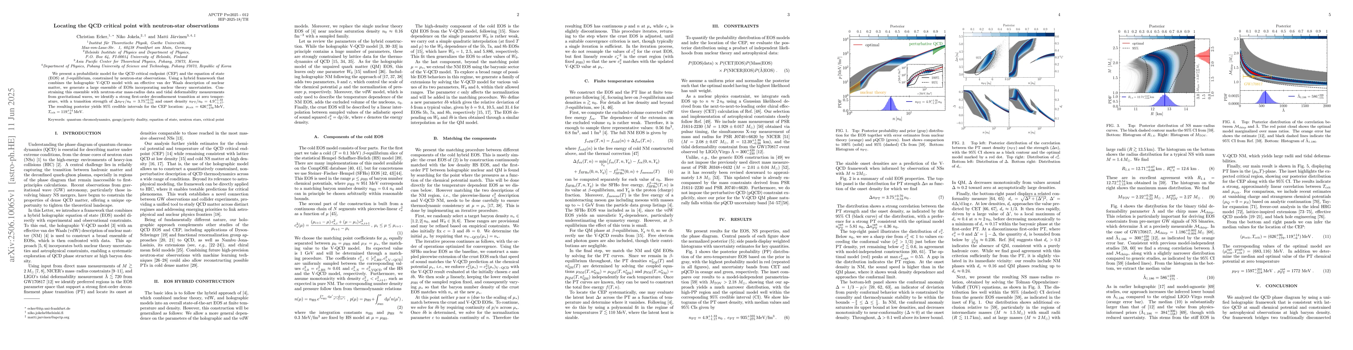We present a probabilistic model for the QCD critical endpoint (CEP) and the equation of state (EOS) at $\beta$-equilibrium, constrained by neutron-star observations. Using a hybrid framework that combines the holographic V-QCD model with an effective van der Waals description of nuclear matter, we generate a large ensemble of EOSs incorporating nuclear theory uncertainties. Constraining this ensemble with neutron-star mass-radius data and tidal deformability measurements from gravitational waves, we identify a strong first-order deconfinement transition at zero temperature, with a transition strength of $\Delta n_{\rm{PT}}/n_0 = 3.75^{+0.70}_{-0.53}$ and onset density $n_{\rm{PT}}/n_0 = 4.9^{+1.33}_{-1.17}$. The resulting posterior yields $95\%$ credible intervals for the CEP location: $\mu_{\rm{crit}} = 626^{+90}_{-179}\,\rm{MeV}$, $T_{\rm{crit}} = 119^{+14}_{-6}\,\rm{MeV}$.