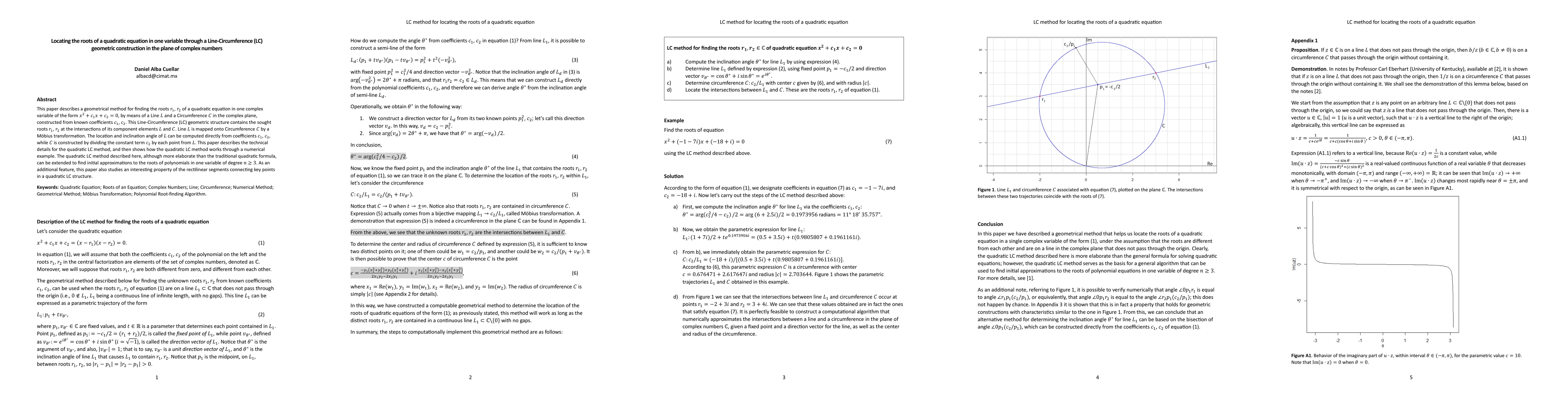 This paper presents a geometrical method to locate the roots of a quadratic equation using a Line-Circumference (LC) construction in the complex plane, involving intersections between a Line and a Circumference, mapped through a Möbius transformation. The method can also be extended for initial approximations of higher-degree polynomial roots.