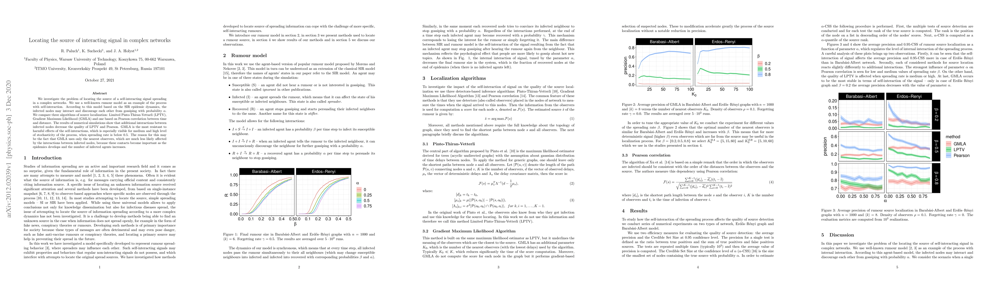 We investigate the problem of locating the source of a self-interacting signal spreading in a complex networks. We use a well-known rumour model as an example of the process with self-interaction. According to this model based on the SIR epidemic dynamics, the infected nodes may interact and discourage each other from gossiping with probability $\alpha$. We compare three algorithms of source localization: Limited Pinto-Thiran-Vettarli (LPTV), Gradient Maximum Likelihood (GMLA) and one based on Pearson correlation between time and distance. The results of numerical simulations show that additional interactions between infected nodes decrease the quality of LPTV and Pearson. GMLA is the most resistant to harmful effects of the self-interactions, which is especially visible for medium and high level of stochasticity of the process, when spreading rate is below 0.5. The reason for this may be the fact that GMLA uses only the nearest observers, which are much less likely affected by the interactions between infected nodes, because these contacts become important as the epidemics develops and the number of infected agents increases.