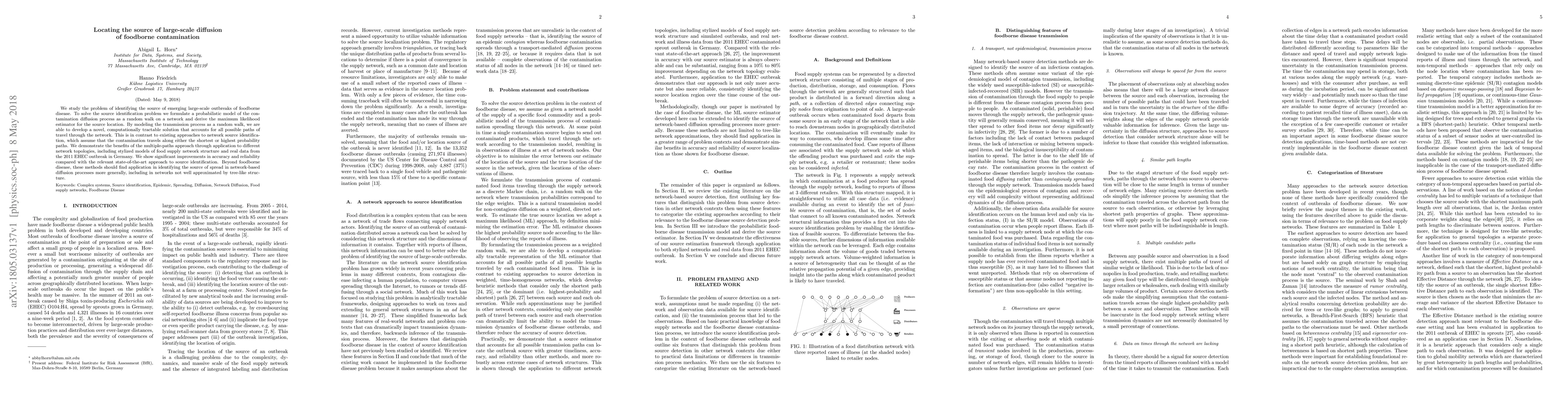 We study the problem of identifying the source of emerging large-scale outbreaks of foodborne disease. To solve the source identification problem we formulate a probabilistic model of the contamination diffusion process as a random walk on a network and derive the maximum likelihood estimator for the source location. By modeling the transmission process as a random walk, we are able to develop a novel, computationally tractable solution that accounts for all possible paths of travel through the network. This is in contrast to existing approaches to network source identification, which assume that the contamination travels along either the shortest or highest probability paths. We demonstrate the benefits of the multiple-paths approach through application to different network topologies, including stylized models of food supply network structure and real data from the 2011 EHEC outbreak in Germany. We show significant improvements in accuracy and reliability compared with the relevant state-of-the-art approach to source identification. Beyond foodborne disease, these methods should find application in identifying the source of spread in network-based diffusion processes more generally, including in networks not well approximated by tree-like structure.