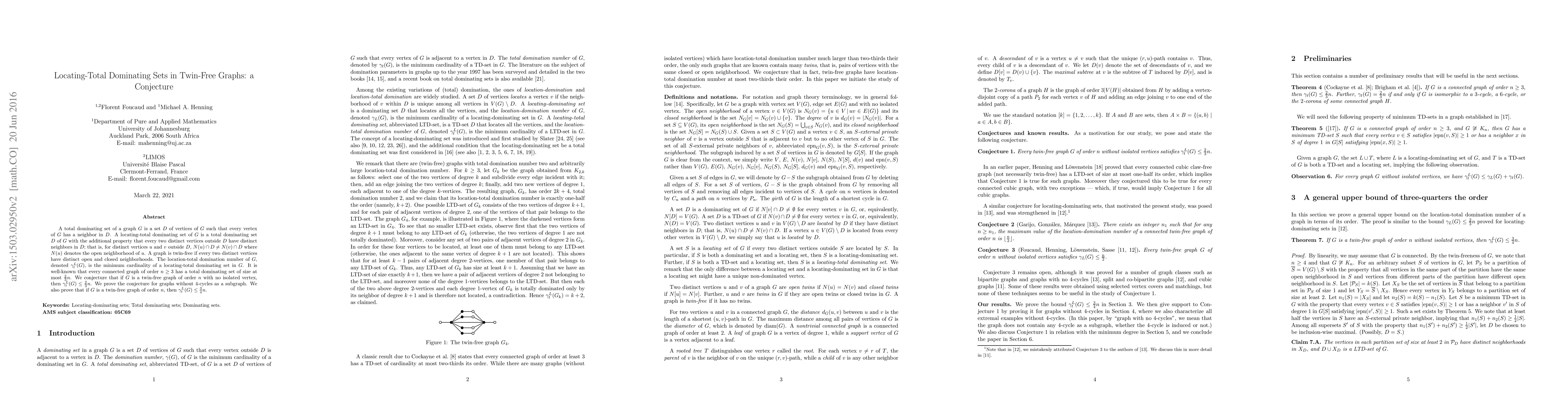 Researchers prove a conjecture that twin-free graphs with no isolated vertex have a locating-total dominating set of size at most 2/3 the number of vertices, improving upon previous bounds for total dominating sets.