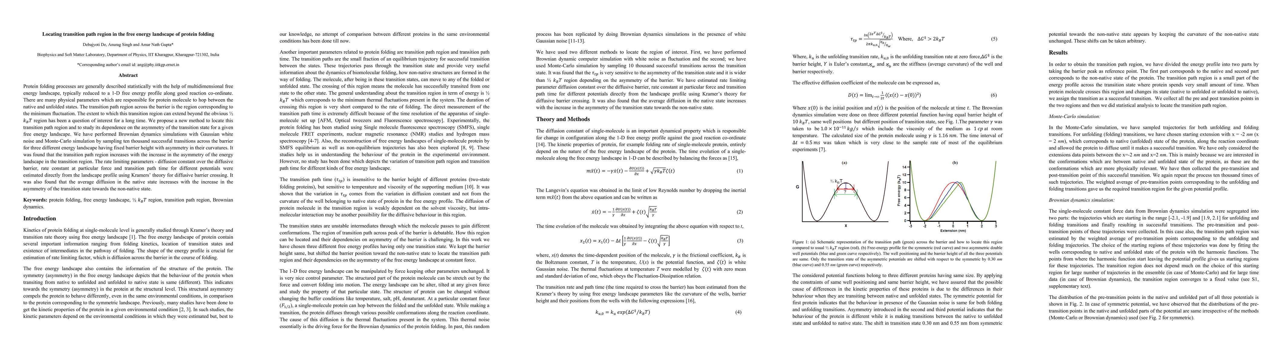 This paper proposes a new method to identify the transition path region in protein folding's free energy landscape, revealing that this region expands with increased asymmetry in the energy landscape. Simulations show that the diffusion constant and transition path time are influenced by the landscape's curvature asymmetry.