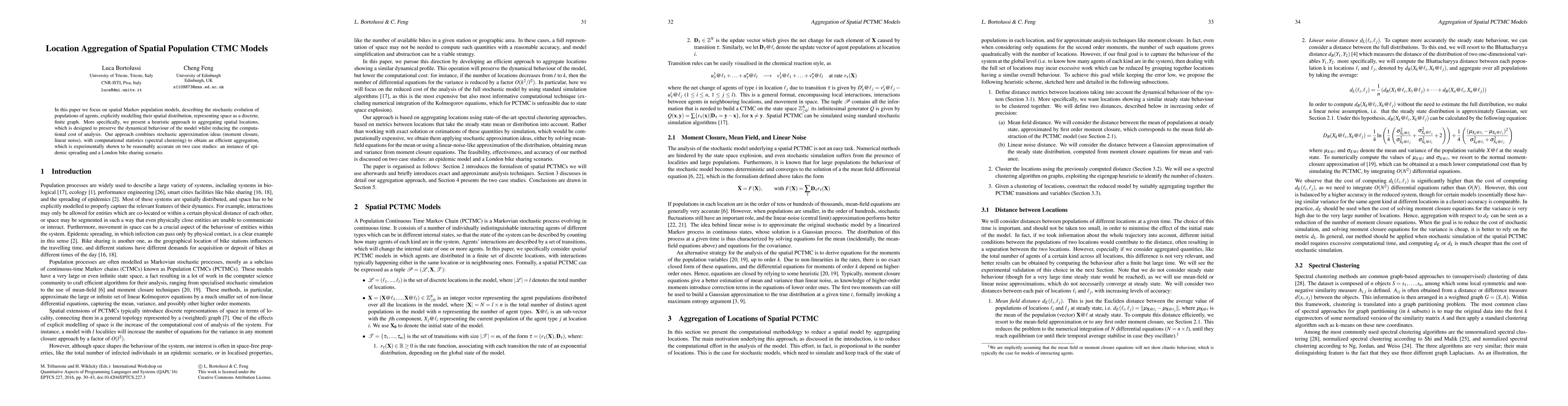 In this paper we focus on spatial Markov population models, describing the stochastic evolution of populations of agents, explicitly modelling their spatial distribution, representing space as a discrete, finite graph. More specifically, we present a heuristic approach to aggregating spatial locations, which is designed to preserve the dynamical behaviour of the model whilst reducing the computational cost of analysis. Our approach combines stochastic approximation ideas (moment closure, linear noise), with computational statistics (spectral clustering) to obtain an efficient aggregation, which is experimentally shown to be reasonably accurate on two case studies: an instance of epidemic spreading and a London bike sharing scenario.
