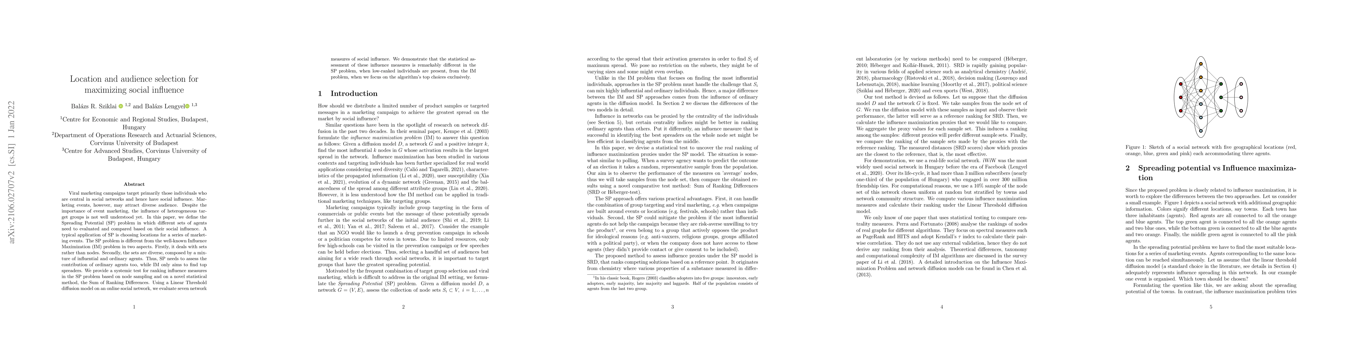 Viral marketing campaigns target primarily those individuals who are central in social networks and hence have social influence. Marketing events, however, may attract diverse audience. Despite the importance of event marketing, the influence of heterogeneous target groups is not well understood yet. In this paper, we define the Spreading Potential (SP) problem in which different sets of agents need to evaluated and compared based on their social influence. A typical application of SP is choosing locations for a series of marketing events. The SP problem is different from the well-known Influence Maximization (IM) problem in two aspects. Firstly, it deals with sets rather than nodes. Secondly, the sets are diverse, composed by a mixture of influential and ordinary agents. Thus, SP needs to assess the contribution of ordinary agents too, while IM only aims to find top spreaders. We provide a systemic test for ranking influence measures in the SP problem based on node sampling and on a novel statistical method, the Sum of Ranking Differences. Using a Linear Threshold diffusion model on an online social network, we evaluate seven network measures of social influence. We demonstrate that the statistical assessment of these influence measures is remarkably different in the SP problem, when low-ranked individuals are present, from the IM problem, when we focus on the algorithm's top choices exclusively.