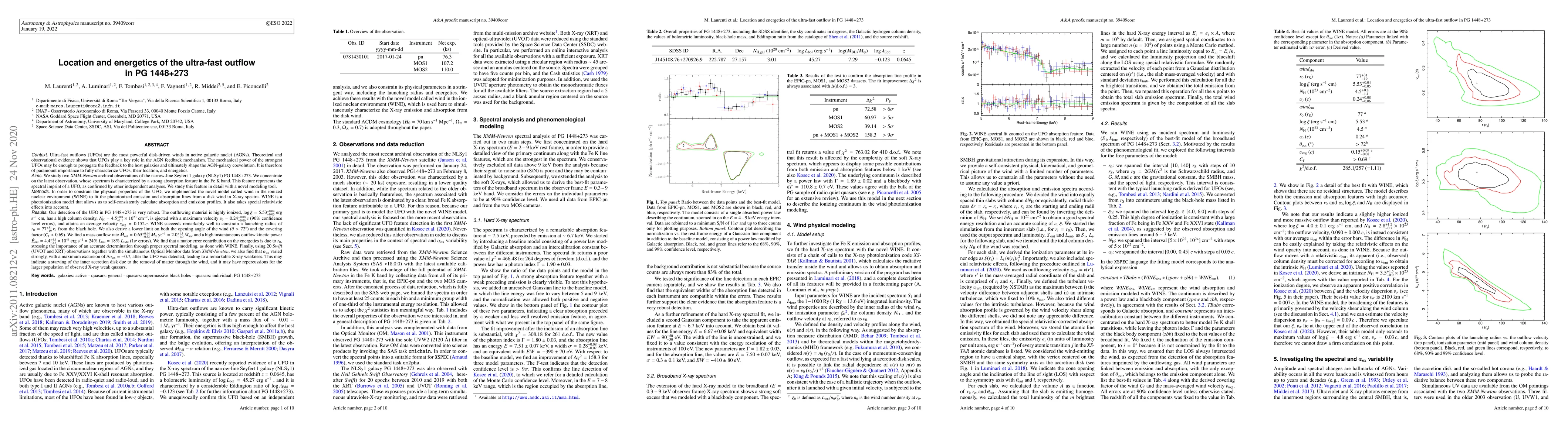 Ultra-fast outflows (UFOs) play a key role in the AGN feedback mechanism. It is therefore important to fully characterize their location and energetics. We study the UFO in the latest XMM-Newton archival observation of the NLSy1 galaxy PG 1448+273 by means of a novel modeling tool, that is, the Wind in the Ionized Nuclear Environment model (WINE). Our detection of the UFO in PG 1448+273 is very robust. The outflowing material is highly ionized, $\log\xi = 5.53_{-0.05}^{+0.04}$ erg s$^{-1}$ cm, has a large column density, $N_\mathrm{H} = 4.5_{-1.1}^{+0.8} \times 10^{23}$ cm$^{-2}$, is ejected with a maximum velocity $v_0 = 0.24^{+0.08}_{-0.06}\,c$ (90% c.l. errors), and attains an average velocity $v_\mathrm{avg} = 0.152\,c$. WINE succeeds remarkably well to constrain a launching radius of $r_0=77_{-19}^{+31} \, r_\mathrm{S}$ from the black hole. We also derive a lower limit on both the opening angle of the wind ($\theta > 72^{\circ}$) and the covering factor ($C_\mathrm{f} > 0.69$). We find a mass outflow rate $\dot{M}_\mathrm{out}=0.65^{+0.44}_{-0.33}\,M_\odot \mathrm{yr}^{-1} = 2.0^{+1.3}_{-1.0}\, \dot{M}_\mathrm{acc}$ and a large instantaneous outflow kinetic power $\dot{E}_\mathrm{out}=4.4^{+4.4}_{-3.6} \times 10^{44}$ erg s$^{-1}$ = 24% $L_\mathrm{bol}$ = 18% $L_\mathrm{Edd}$ ($1 \sigma$ errors). We find that a major error contribution on the energetics is due to $r_0$, stressing the importance of an accurate determination through a proper spectral modeling, as done with WINE. Using 20 Swift (UVOT and XRT) observations and the simultaneous OM data from XMM-Newton, we also find that $\alpha_\mathrm{ox}$ undergoes large variations, with a maximum excursion of $\Delta\alpha_\mathrm{ox} =-0.7$, after the UFO is detected, leading to a remarkable X-ray weakness. This may point towards a starving of the inner accretion disk due to the removal of matter through the wind.