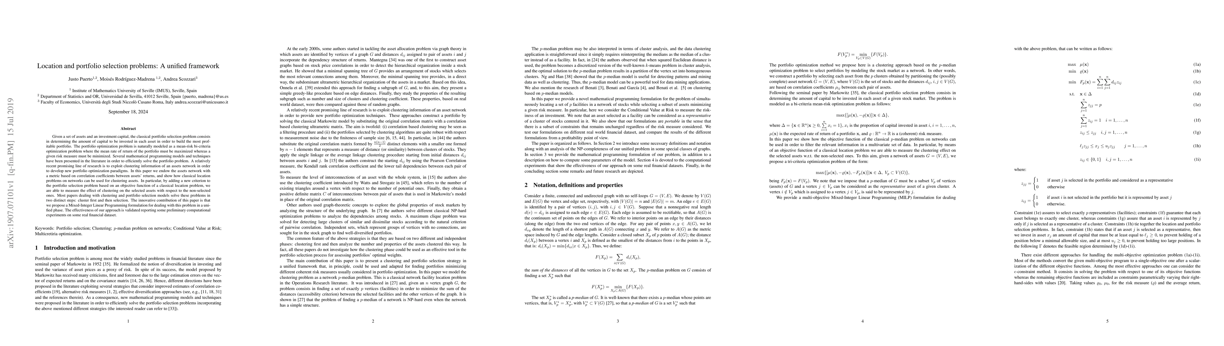 This paper proposes a unified framework for portfolio selection that incorporates clustering information of an assets network, allowing for more efficient optimization of both location and portfolio selection in one step.