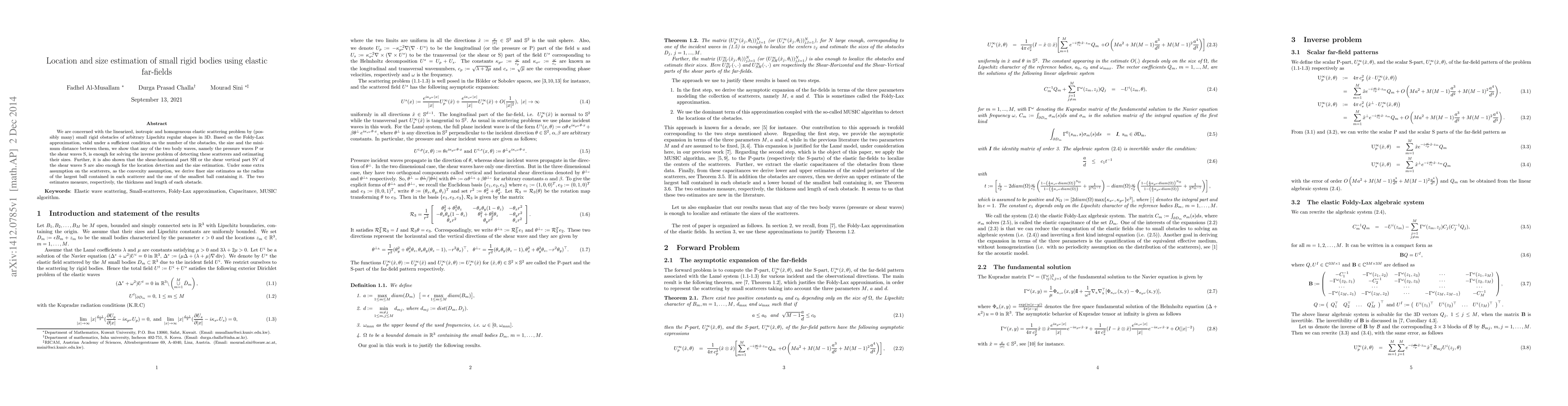 We are concerned with the linearized, isotropic and homogeneous elastic scattering problem by (possibly many) small rigid obstacles of arbitrary Lipschitz regular shapes in 3D. Based on the Foldy-Lax approximation, valid under a sufficient condition on the number of the obstacles, the size and the minimum distance between them, we show that any of the two body waves, namely the pressure waves P or the shear waves S, is enough for solving the inverse problem of detecting these scatterers and estimating their sizes. Further, it is also shown that the shear-horizontal part SH or the shear vertical part SV of the shear waves S are also enough for the location detection and the size estimation. Under some extra assumption on the scatterers, as the convexity assumption, we derive finer size estimates as the radius of the largest ball contained in each scatterer and the one of the smallest ball containing it. The two estimates measure, respectively, the thickness and length of each obstacle.