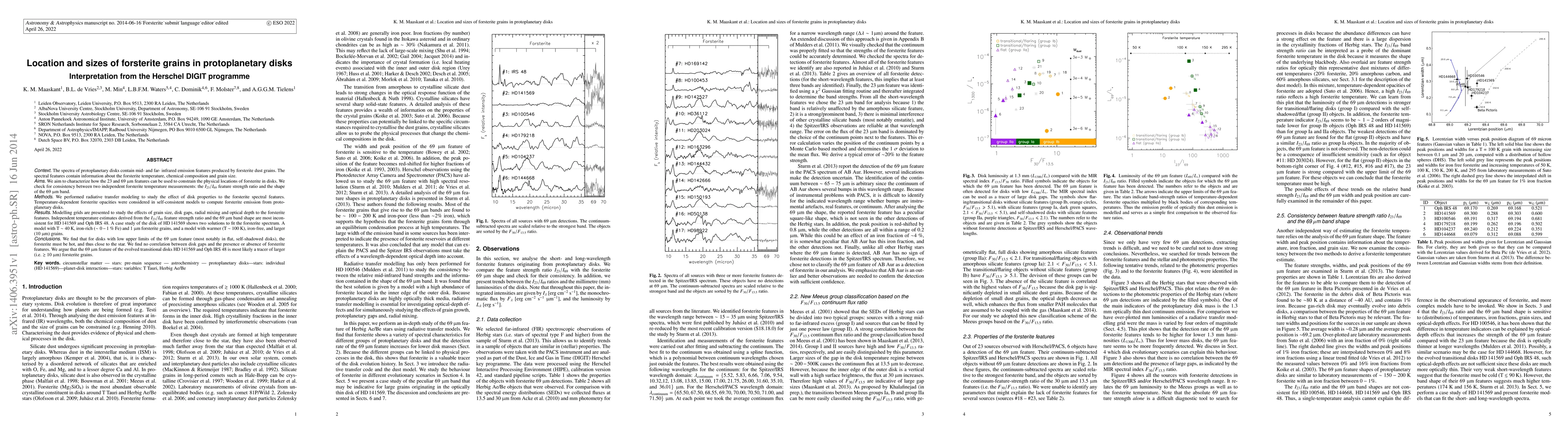 This paper investigates the spectral features of forsterite dust grains in protoplanetary disks using data from the Herschel DIGIT programme, aiming to determine the physical locations and sizes of forsterite grains. The study finds that the 69 micron feature is a tracer of larger forsterite grains, often located closer to the star, and highlights inconsistencies in temperature measurements for specific disks.
