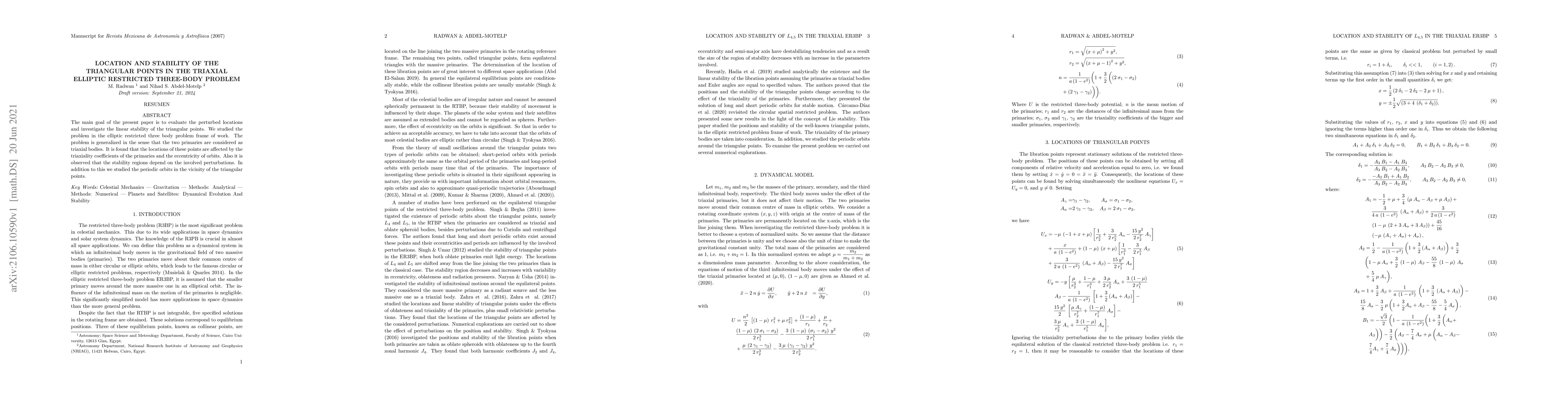 The main goal of the present paper is to evaluate the perturbed locations and investigate the linear stability of the triangular points. We studied the problem in the elliptic restricted three body problem frame of work. The problem is generalized in the sense that the two primaries are considered as triaxial bodies. It is found that the locations of these points are affected by the triaxiality coefficients of the primaries and the eccentricity of orbits. Also it is observed that the stability regions depend on the involved perturbations. In addition to this we studied the periodic orbits in the vicinity of the triangular points.