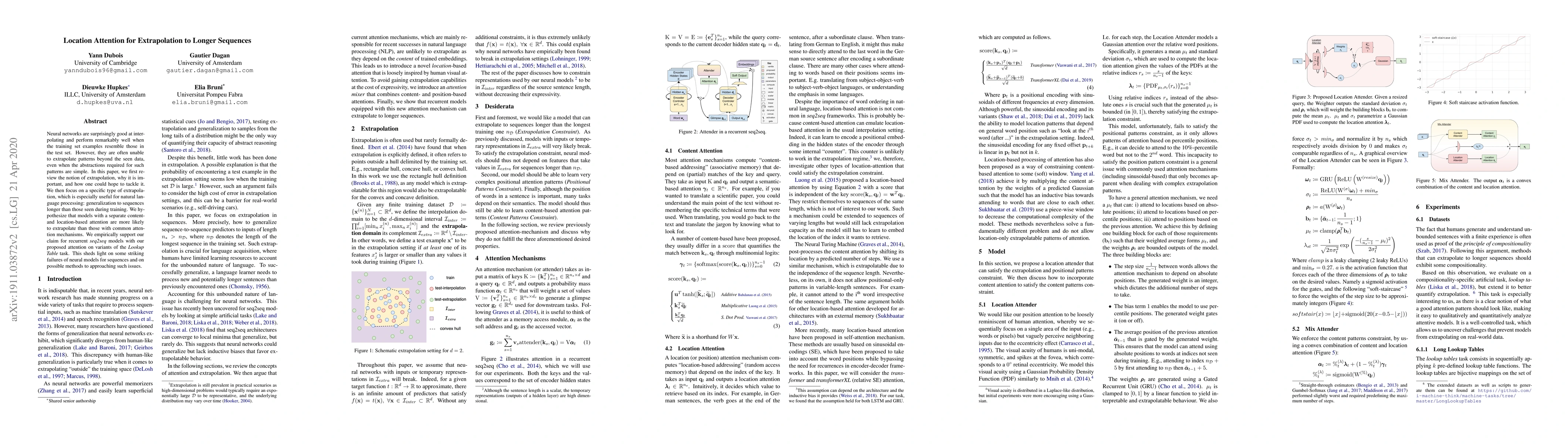 This paper explores the concept of extrapolation in neural networks, particularly focusing on the ability to generalize to longer sequences than those seen during training. It proposes that models utilizing separate content- and location-based attention mechanisms are better at this task than those using common attention mechanisms, supported by empirical results on recurrent seq2seq models.