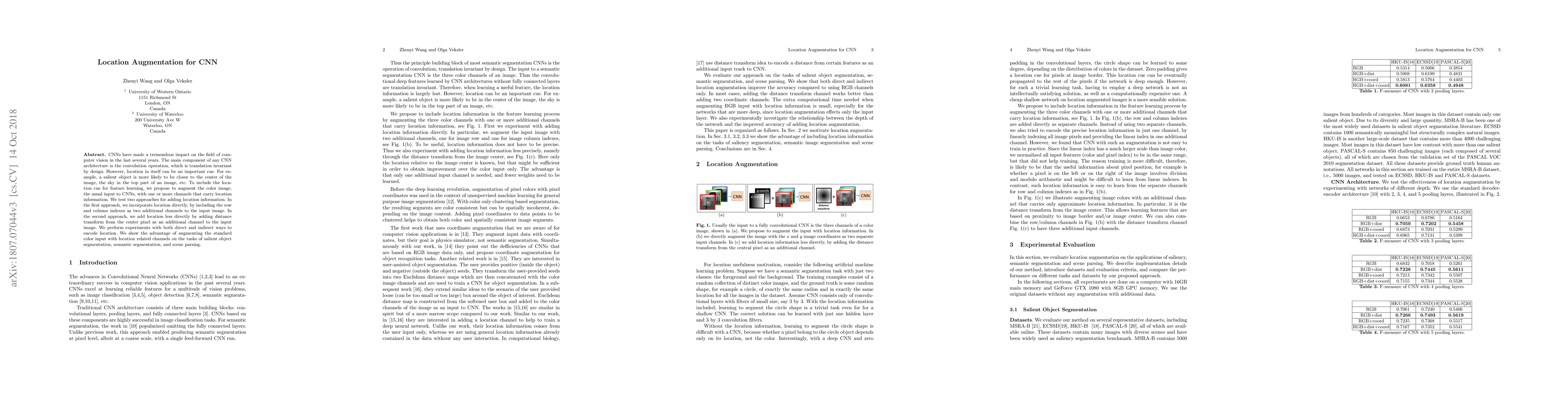 CNNs have made a tremendous impact on the field of computer vision in the last several years. The main component of any CNN architecture is the convolution operation, which is translation invariant by design. However, location in itself can be an important cue. For example, a salient object is more likely to be closer to the center of the image, the sky in the top part of an image, etc. To include the location cue for feature learning, we propose to augment the color image, the usual input to CNNs, with one or more channels that carry location information. We test two approaches for adding location information. In the first approach, we incorporate location directly, by including the row and column indexes as two additional channels to the input image. In the second approach, we add location less directly by adding distance transform from the center pixel as an additional channel to the input image. We perform experiments with both direct and indirect ways to encode location. We show the advantage of augmenting the standard color input with location related channels on the tasks of salient object segmentation, semantic segmentation, and scene parsing.