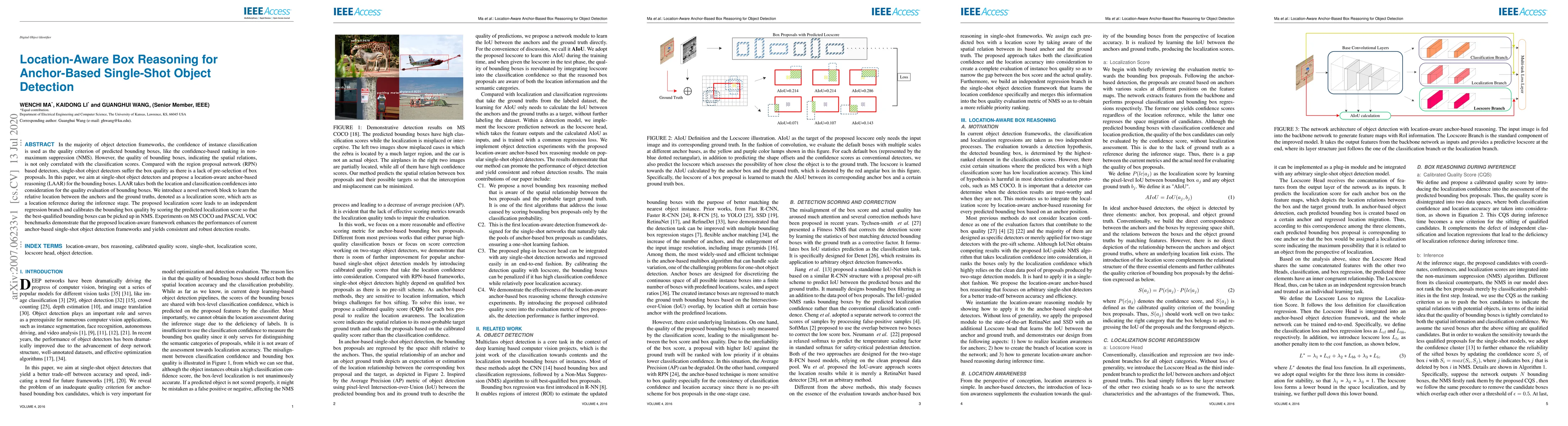 In the majority of object detection frameworks, the confidence of instance classification is used as the quality criterion of predicted bounding boxes, like the confidence-based ranking in non-maximum suppression (NMS). However, the quality of bounding boxes, indicating the spatial relations, is not only correlated with the classification scores. Compared with the region proposal network (RPN) based detectors, single-shot object detectors suffer the box quality as there is a lack of pre-selection of box proposals. In this paper, we aim at single-shot object detectors and propose a location-aware anchor-based reasoning (LAAR) for the bounding boxes. LAAR takes both the location and classification confidences into consideration for the quality evaluation of bounding boxes. We introduce a novel network block to learn the relative location between the anchors and the ground truths, denoted as a localization score, which acts as a location reference during the inference stage. The proposed localization score leads to an independent regression branch and calibrates the bounding box quality by scoring the predicted localization score so that the best-qualified bounding boxes can be picked up in NMS. Experiments on MS COCO and PASCAL VOC benchmarks demonstrate that the proposed location-aware framework enhances the performances of current anchor-based single-shot object detection frameworks and yields consistent and robust detection results.