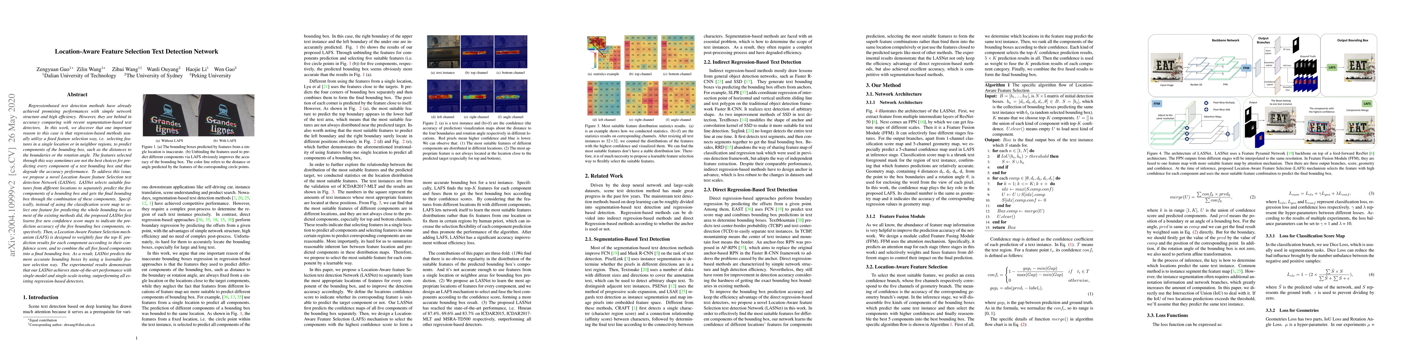 The paper proposes LASNet, a novel Location-Aware Feature Selection text detection network that selects features from different locations to predict the bounding box components more accurately. LASNet uses five confidence score maps for each component and a Location-Aware Feature Selection mechanism to fuse top-K predictions, achieving state-of-the-art performance over existing regression-based detectors.