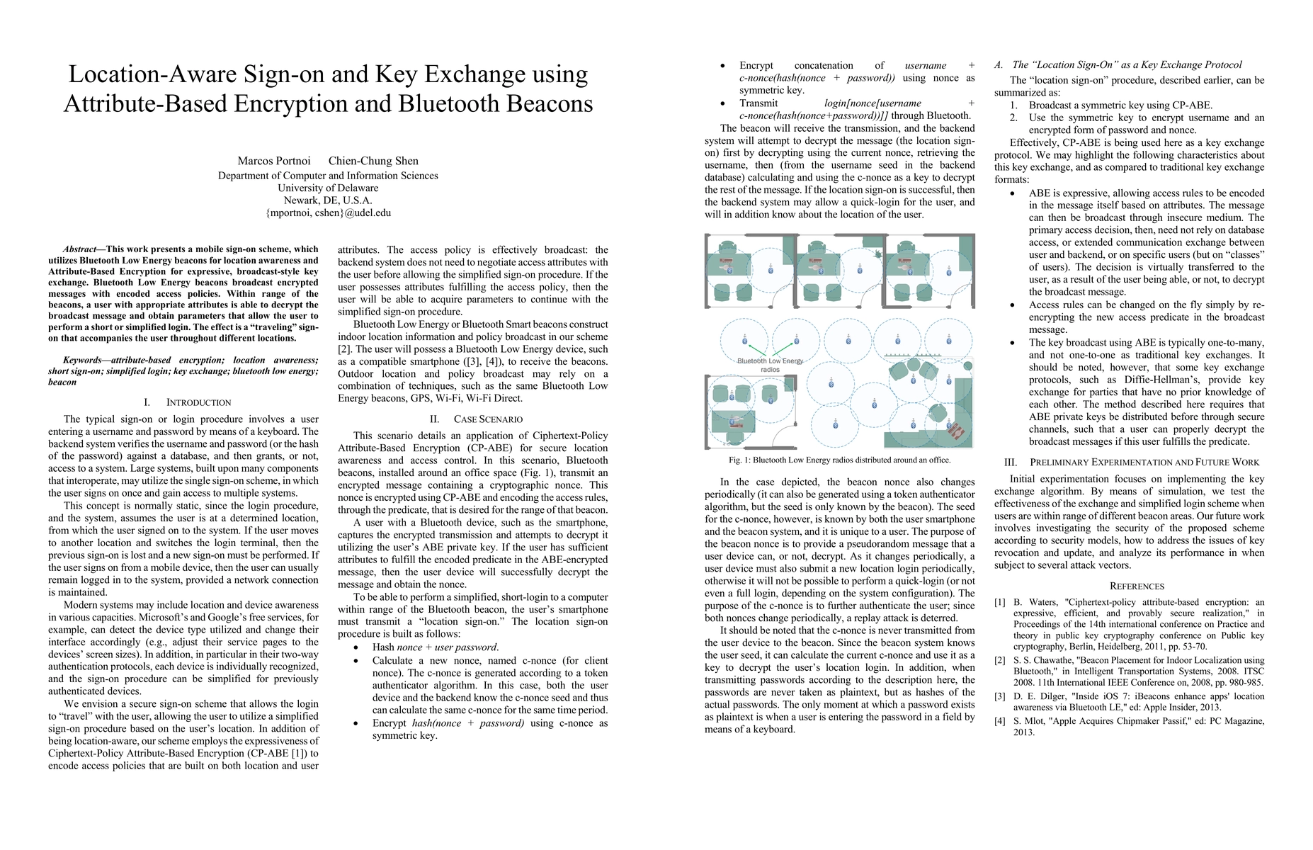 This paper proposes a mobile sign-on method using Bluetooth Low Energy beacons for location awareness and Attribute-Based Encryption for secure key exchange. Users with matching attributes can decrypt beacon messages to perform simplified logins, enabling a seamless "traveling" sign-on experience.