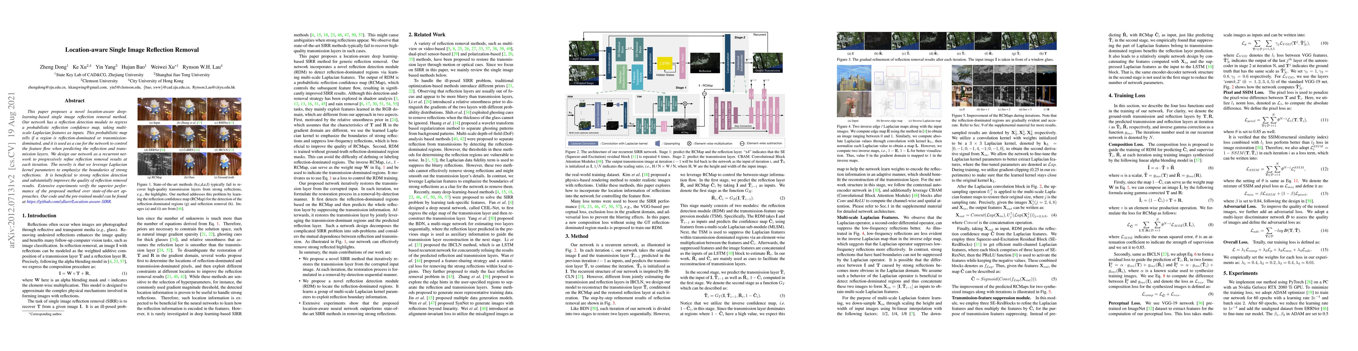 This paper introduces a deep-learning-based method for single image reflection removal using a recurrent network with a reflection detection module to create a probabilistic reflection map. The method leverages Laplacian kernel parameters to emphasize strong reflection boundaries, significantly improving reflection removal quality.