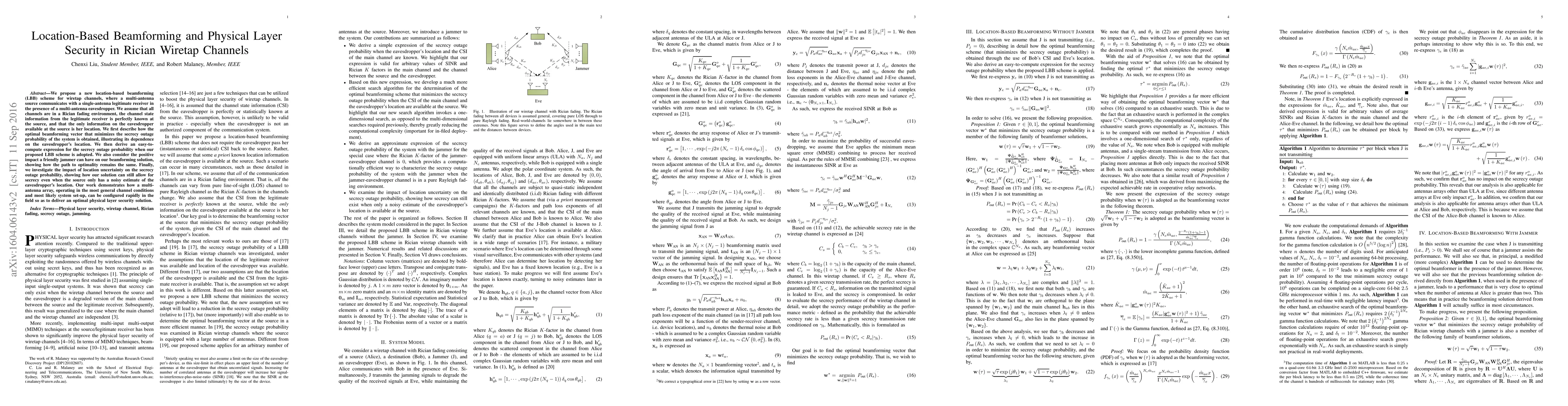 This paper proposes a location-based beamforming scheme for secure communication in Rician wiretap channels, optimizing the beamforming vector to minimize secrecy outage probability based on the eavesdropper's location. It also explores the benefits of a friendly jammer and the impact of location uncertainty on security.