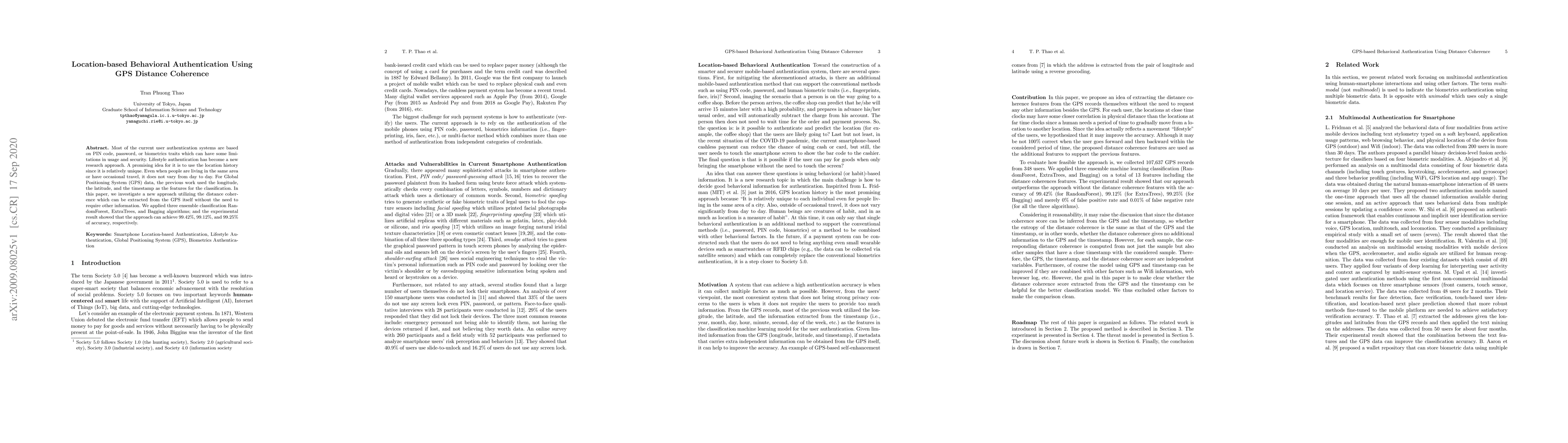 A new authentication method uses GPS distance coherence to verify user identities with high accuracy, achieving 99.42% accuracy in experiments. This approach offers a unique alternative to traditional methods like PIN codes or biometrics.