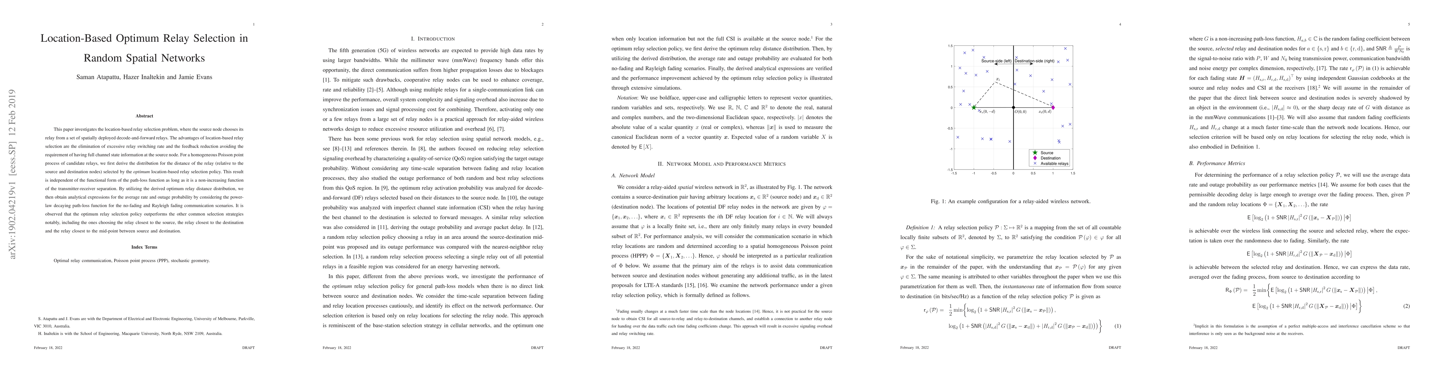 This paper explores the optimal relay selection based on location in random spatial networks, deriving the distance distribution for selected relays and showing improved performance over traditional methods. Analytical expressions for average rate and outage probability are obtained, demonstrating superior outcomes under various path-loss scenarios.