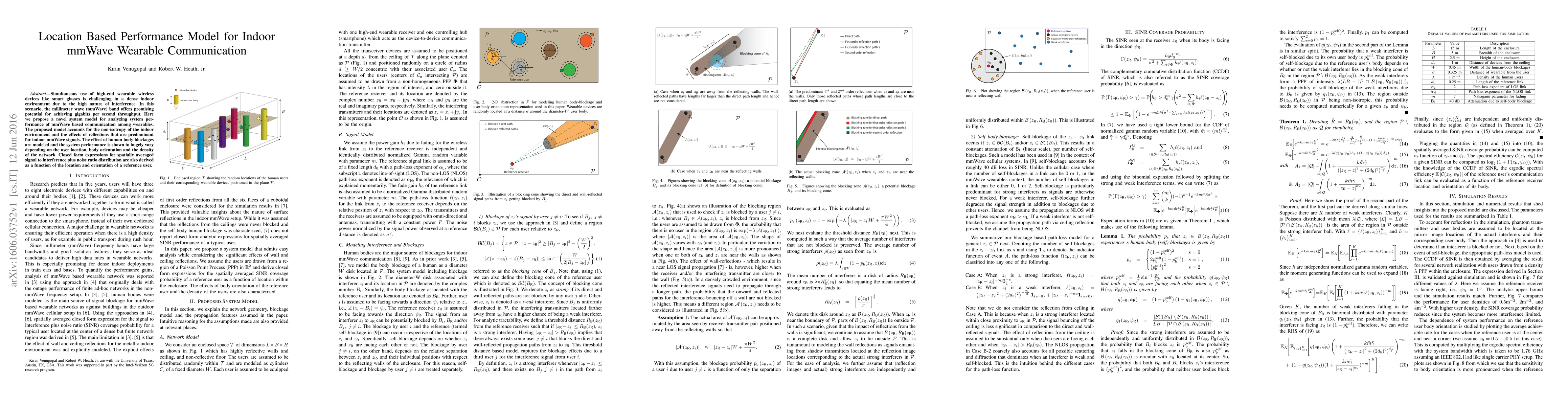 This paper proposes a novel location-based performance model for mmWave communication in indoor wearables, accounting for non-isotropy, reflections, and human body blockages. The model demonstrates significant performance variations based on user location, body orientation, and network density, with derived closed-form expressions for signal-to-interference plus noise ratio distribution.