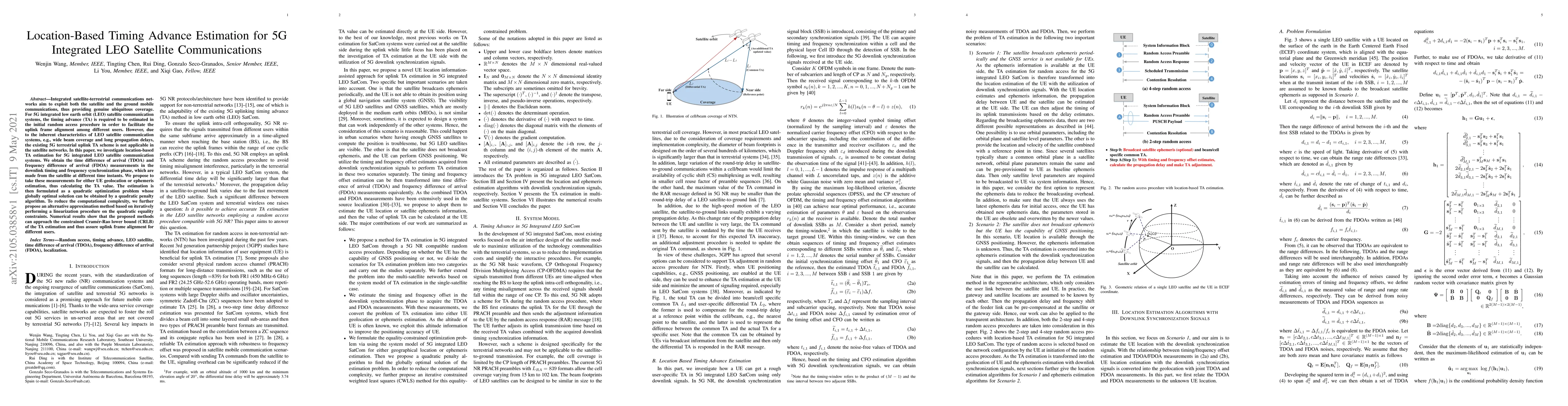 This paper proposes a location-based timing advance estimation method for 5G integrated low earth orbit (LEO) satellite communication systems, addressing the challenges posed by wide beam coverage and long propagation delays. The method utilizes time and frequency difference of arrival measurements for geolocation or ephemeris estimation, formulated as a quadratic optimization problem, with an alternative approximation method to reduce computational complexity.