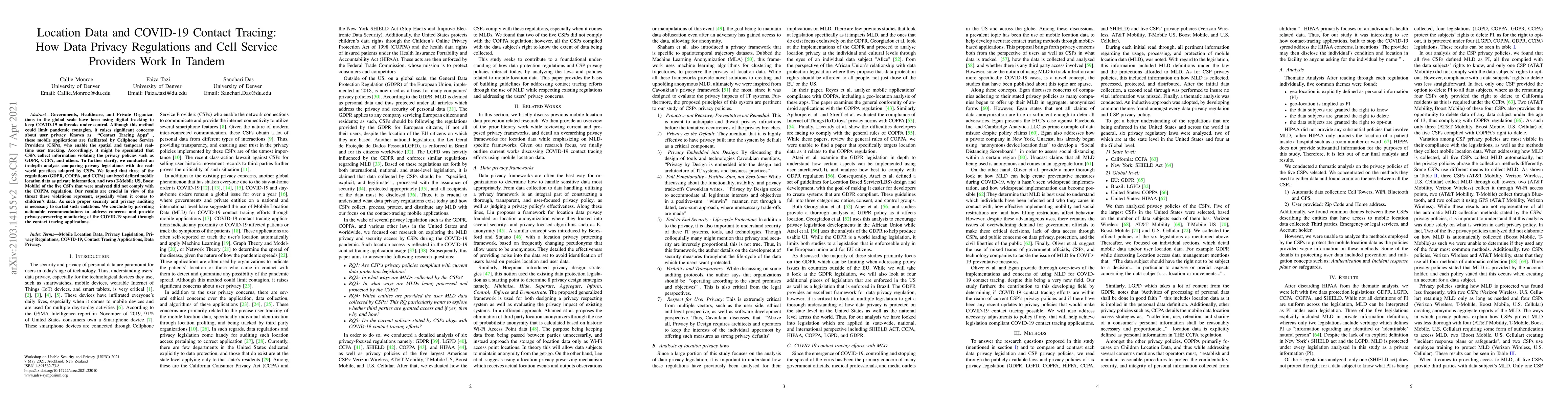 Governments, Healthcare, and Private Organizations in the global scale have been using digital tracking to keep COVID-19 outbreaks under control. Although this method could limit pandemic contagion, it raises significant concerns about user privacy. Known as ~"Contact Tracing Apps", these mobile applications are facilitated by Cellphone Service Providers (CSPs), who enable the spatial and temporal real-time user tracking. Accordingly, it might be speculated that CSPs collect information violating the privacy policies such as GDPR, CCPA, and others. To further clarify, we conducted an in-depth analysis comparing privacy legislations with the real-world practices adapted by CSPs. We found that three of the regulations (GDPR, COPPA, and CCPA) analyzed defined mobile location data as private information, and two (T-Mobile US, Boost Mobile) of the five CSPs that were analyzed did not comply with the COPPA regulation. Our results are crucial in view of the threat these violations represent, especially when it comes to children's data. As such proper security and privacy auditing is necessary to curtail such violations. We conclude by providing actionable recommendations to address concerns and provide privacy-preserving monitoring of the COVID-19 spread through the contact tracing applications.