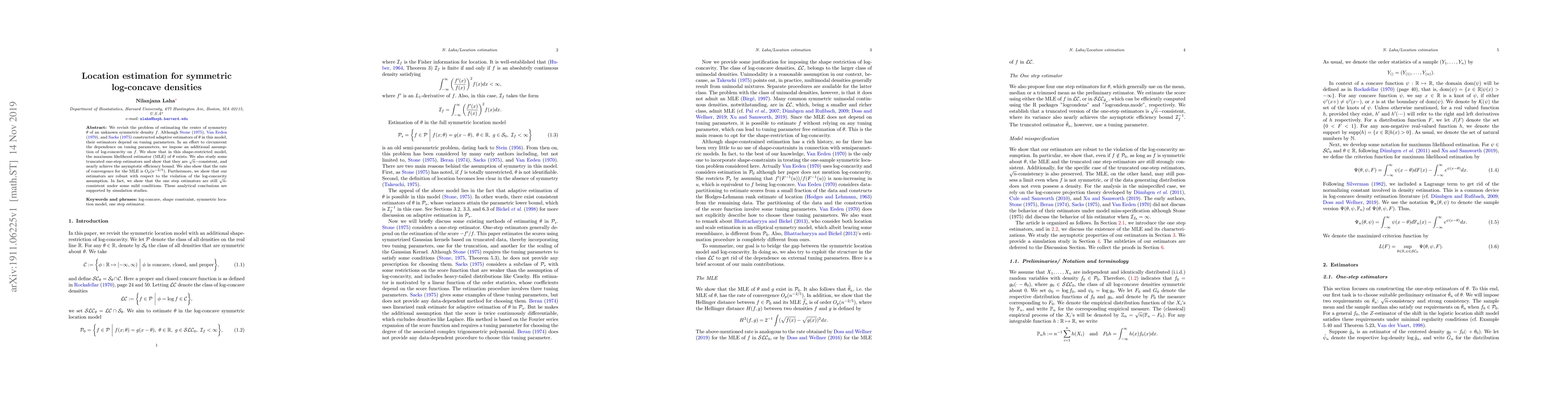Researchers develop an estimator for the center of symmetry in symmetric log-concave densities without relying on tuning parameters. Their results show that the maximum likelihood estimator achieves near-asympotic efficiency and robustness under certain conditions.