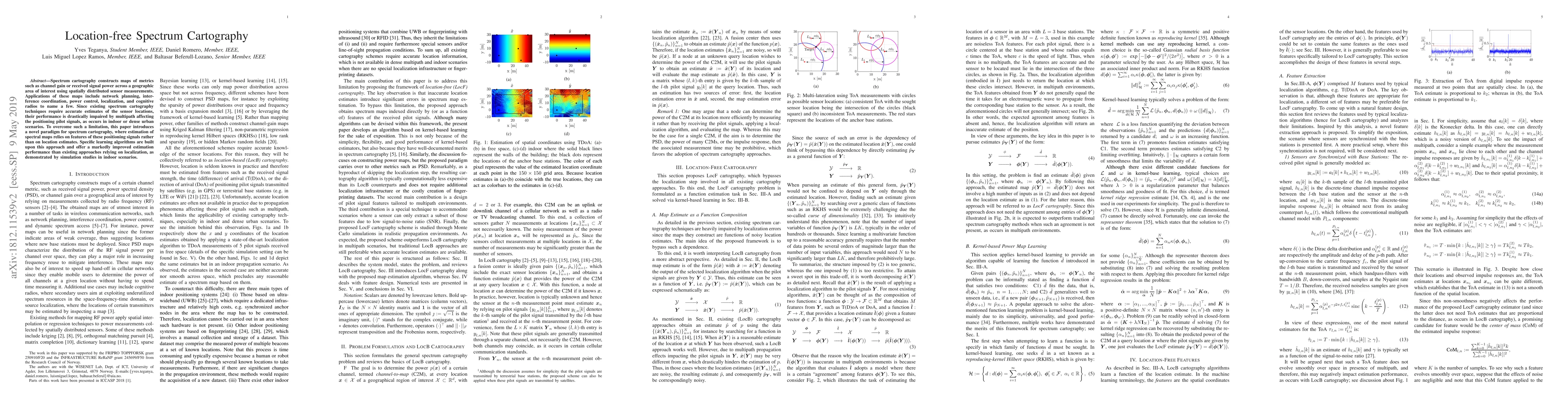 Spectrum cartography constructs maps of metrics such as channel gain or received signal power across a geographic area of interest using spatially distributed sensor measurements. Applications of these maps include network planning, interference coordination, power control, localization, and cognitive radios to name a few. Since existing spectrum cartography techniques require accurate estimates of the sensor locations, their performance is drastically impaired by multipath affecting the positioning pilot signals, as occurs in indoor or dense urban scenarios. To overcome such a limitation, this paper introduces a novel paradigm for spectrum cartography, where estimation of spectral maps relies on features of these positioning signals rather than on location estimates. Specific learning algorithms are built upon this approach and offer a markedly improved estimation performance than existing approaches relying on localization, as demonstrated by simulation studies in indoor scenarios.