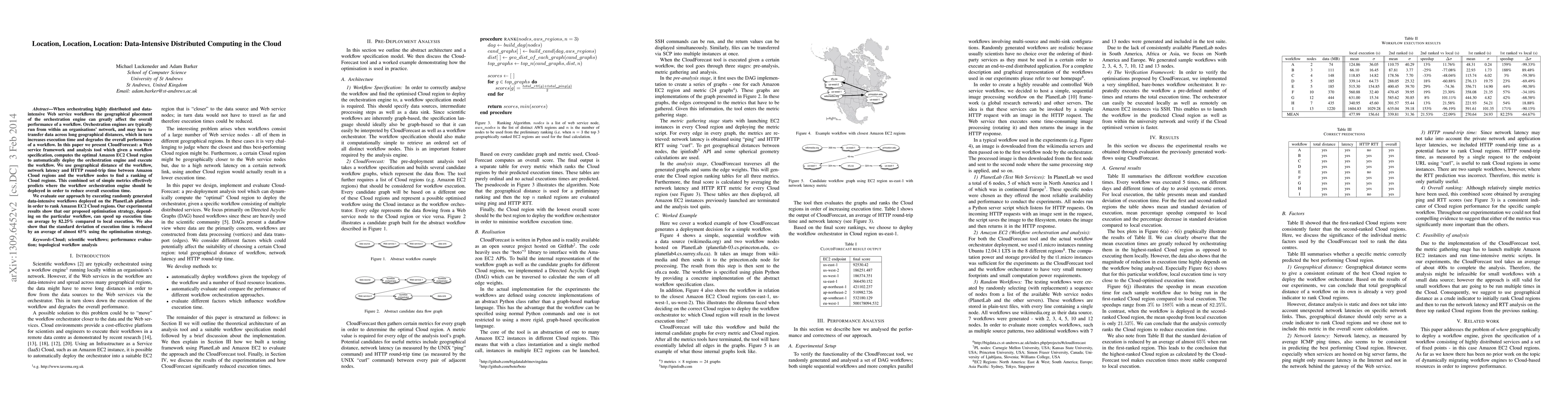 When orchestrating highly distributed and data-intensive Web service workflows the geographical placement of the orchestration engine can greatly affect the overall performance of a workflow. Orchestration engines are typically run from within an organisations' network, and may have to transfer data across long geographical distances, which in turn increases execution time and degrades the overall performance of a workflow. In this paper we present CloudForecast: a Web service framework and analysis tool which given a workflow specification, computes the optimal Amazon EC2 Cloud region to automatically deploy the orchestration engine and execute the workflow. We use geographical distance of the workflow, network latency and HTTP round-trip time between Amazon Cloud regions and the workflow nodes to find a ranking of Cloud regions. This combined set of simple metrics effectively predicts where the workflow orchestration engine should be deployed in order to reduce overall execution time. We evaluate our approach by executing randomly generated data-intensive workflows deployed on the PlanetLab platform in order to rank Amazon EC2 Cloud regions. Our experimental results show that our proposed optimisation strategy, depending on the particular workflow, can speed up execution time on average by 82.25% compared to local execution. We also show that the standard deviation of execution time is reduced by an average of almost 65% using the optimisation strategy.