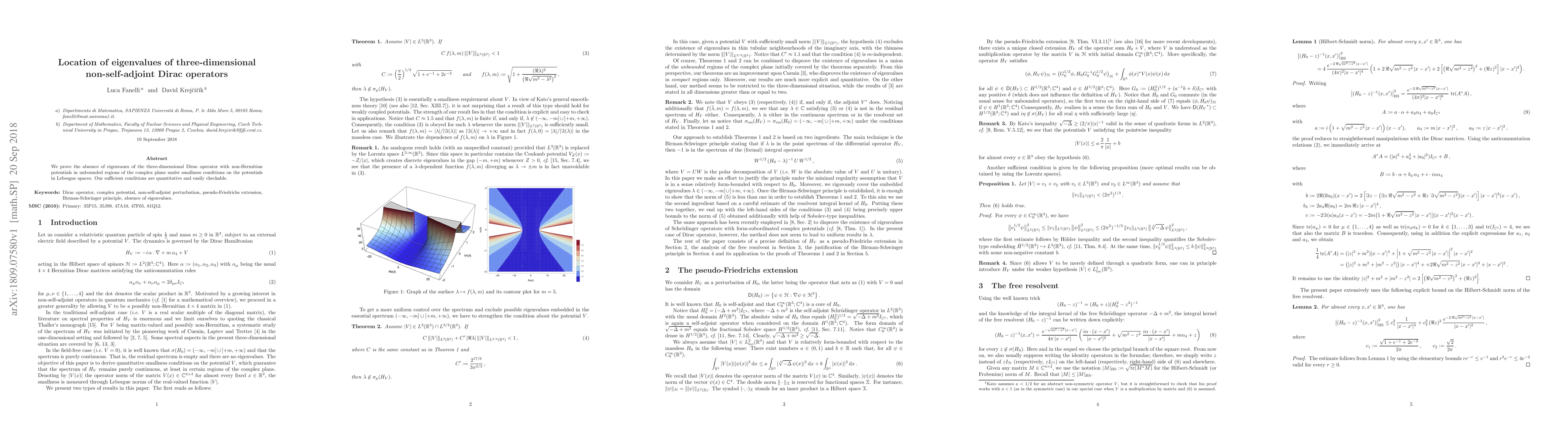 Researchers prove that three-dimensional Dirac operators with non-Hermitian potentials do not have eigenvectors in unbounded regions of the complex plane under smallness conditions.