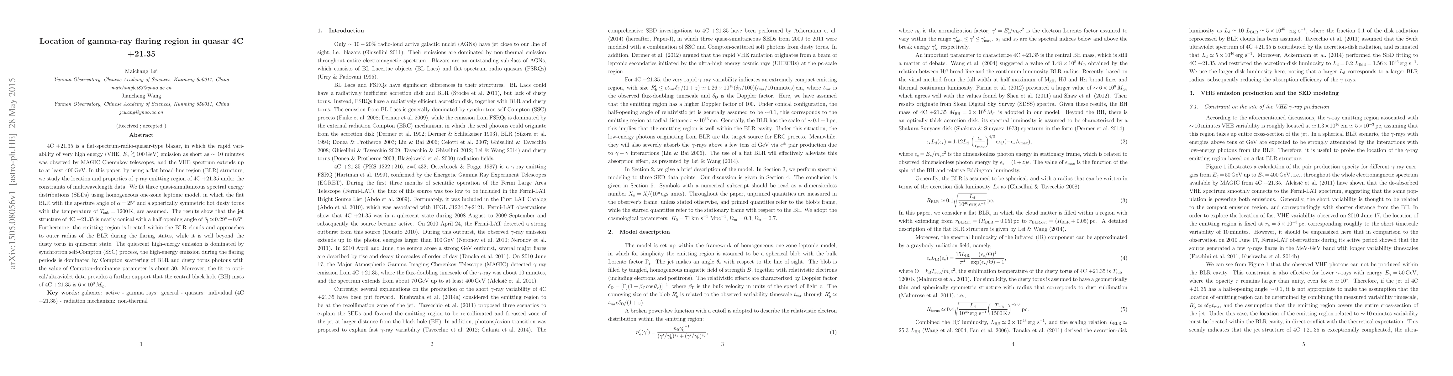 4C +21.35 is a flat-spectrum-radio-quasar-type blazar, in which the rapid variability of very high energy (VHE, $E_{\gamma}\gtrsim 100$\,GeV) emission as short as $\sim$ 10 minutes was observed by MAGIC Cherenkov telescopes, and the VHE spectrum extends up to at least 400\,GeV. In this paper, by using a flat broad-line region (BLR) structure, we study the location and properties of $\gamma$-ray emitting region of 4C +21.35 under the constraints of multiwavelength data. We fit three quasi-simultaneous spectral energy distributions (SEDs) using homogeneous one-zone leptonic model, in which the flat BLR with the aperture angle of $\alpha=25^{\circ}$ and a spherically symmetric hot dusty torus with the temperature of $T_{\rm sub}=1200$\,K, are assumed. The results show that the jet structure of 4C +21.35 is nearly conical with a half-opening angle of $\theta_{\rm j}\simeq 0.29^{\circ}-0.6^{\circ}$. Furthermore, the emitting region is located within the BLR clouds and approaches to outer radius of the BLR during the flaring states, while it is well beyond the dusty torus in quiescent state. The quiescent high-energy emission is dominated by synchrotron self-Compton (SSC) process, the high-energy emission during the flaring periods is dominated by Compton scattering of BLR and dusty torus photons with the value of Compton-dominance parameter is about 30. Moreover, the fit to optical/ultraviolet data provides a further support that the central black hole (BH) mass of 4C +21.35 is $6\times 10^{8}$\,$M_{\odot}$.