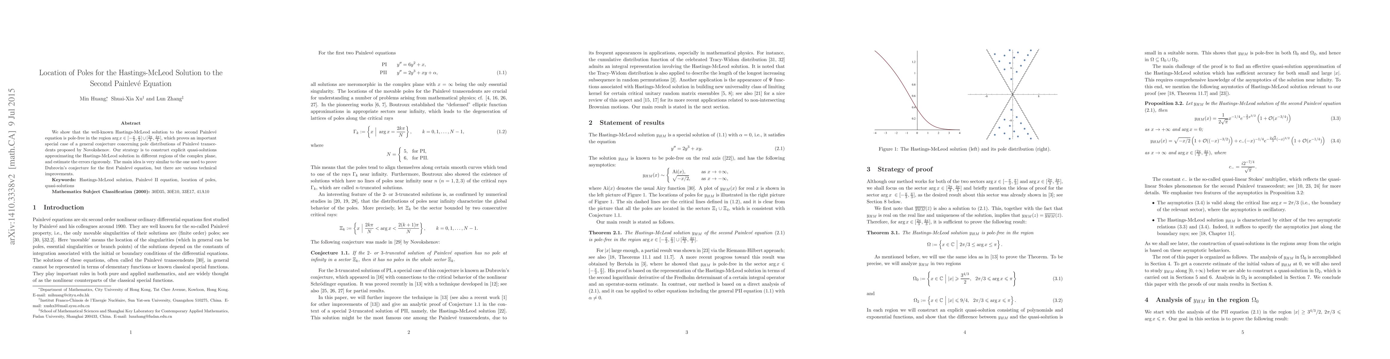 This paper demonstrates that the Hastings-McLeod solution to the second Painlevé equation lacks poles in specific regions of the complex plane, supporting a conjecture on pole distributions for Painlevé transcendents. The authors employ quasi-solutions and rigorous error estimations, adapting techniques used for proving Dubrovin's conjecture for the first Painlevé equation.