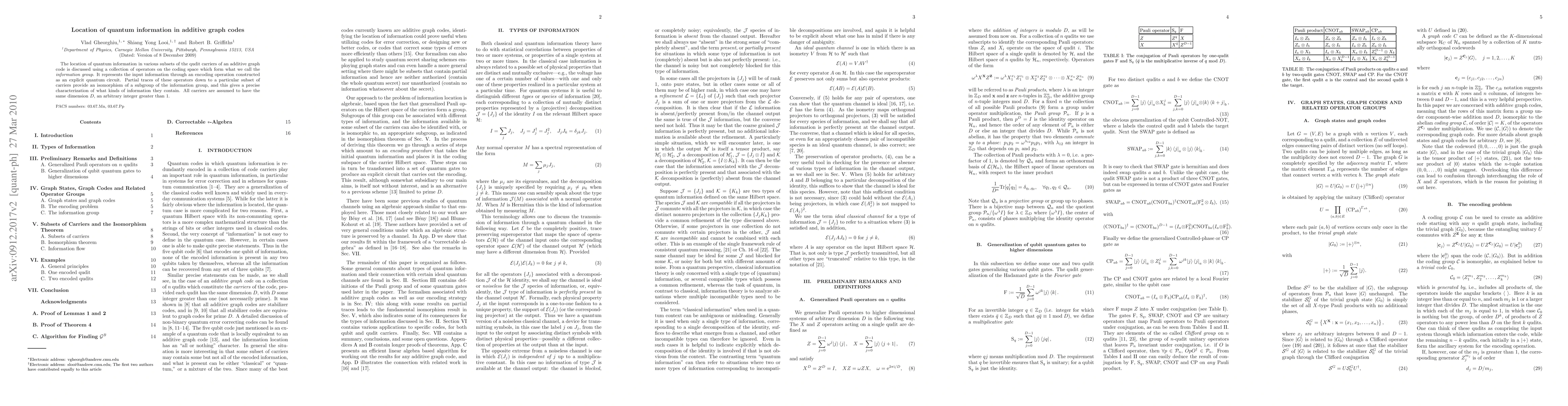 The location of quantum information in various subsets of the qudit carriers of an additive graph code is discussed using a collection of operators on the coding space which form what we call the information group. It represents the input information through an encoding operation constructed as an explicit quantum circuit. Partial traces of these operators down to a particular subset of carriers provide an isomorphism of a subgroup of the information group, and this gives a precise characterization of what kinds of information they contain. All carriers are assumed to have the same dimension D, an arbitrary integer greater than 1.
