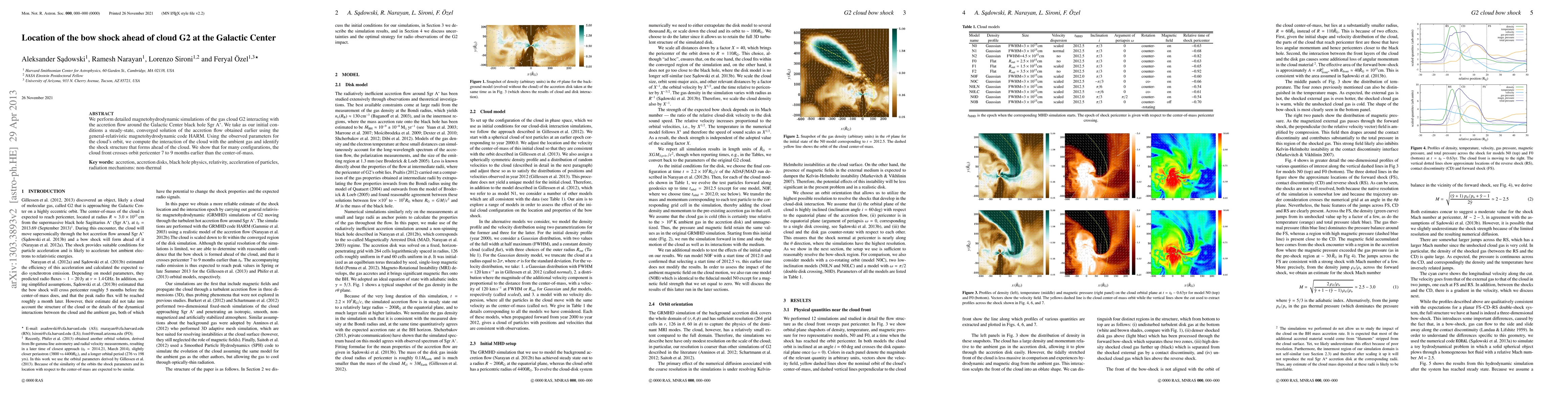 We perform detailed magnetohydrodynamic simulations of the gas cloud G2 interacting with the accretion flow around the Galactic Center black hole Sgr A*. We take as our initial conditions a steady-state, converged solution of the accretion flow obtained earlier using the general-relativistic magnetohydrodynamic code HARM. Using the observed parameters for the cloud's orbit, we compute the interaction of the cloud with the ambient gas and identify the shock structure that forms ahead of the cloud. We show that for many configurations, the cloud front crosses orbit pericenter 7 to 9 months earlier than the center-of-mass.