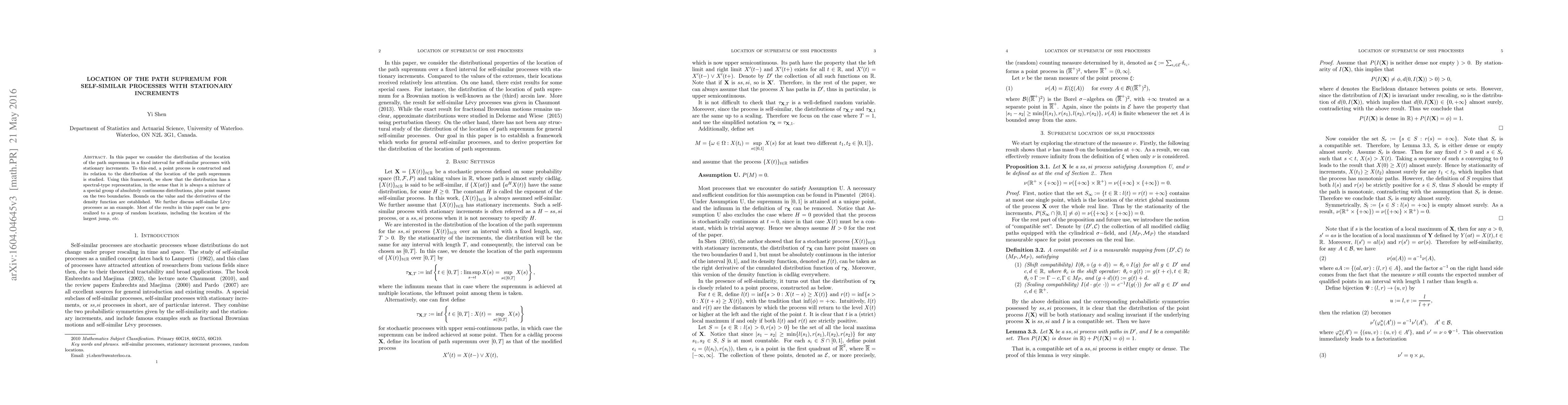 In this paper we consider the distribution of the location of the path supremum in a fixed interval for self-similar processes with stationary increments. To this end, a point process is constructed and its relation to the distribution of the location of the path supremum is studied. Using this framework, we show that the distribution has a spectral-type representation, in the sense that it is always a mixture of a special group of absolutely continuous distributions, plus point masses on the two boundaries. Bounds on the value and the derivatives of the density function are established. We further discuss self-similar L\'{e}vy processes as an example. Most of the results in this paper can be generalized to a group of random locations, including the location of the largest jump, etc.