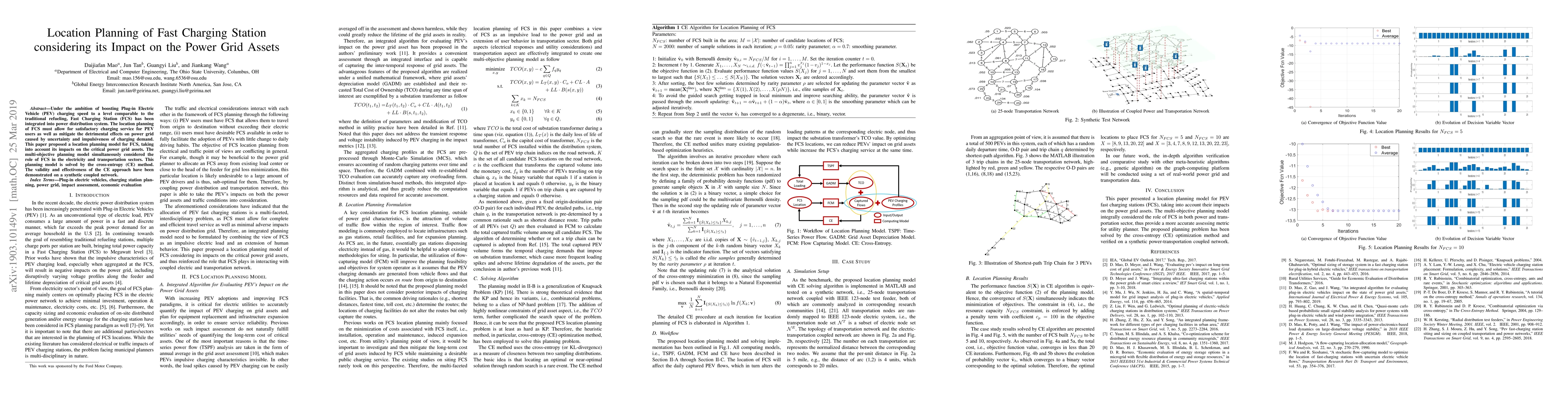 This paper proposes a multi-objective location planning model for Fast Charging Stations (FCS) that balances charging service for Plug-in Electric Vehicles (PEV) users and mitigates grid impact. The model, solved using the cross-entropy method, considers the effects on critical power grid assets and demonstrates its effectiveness on a synthetic network.