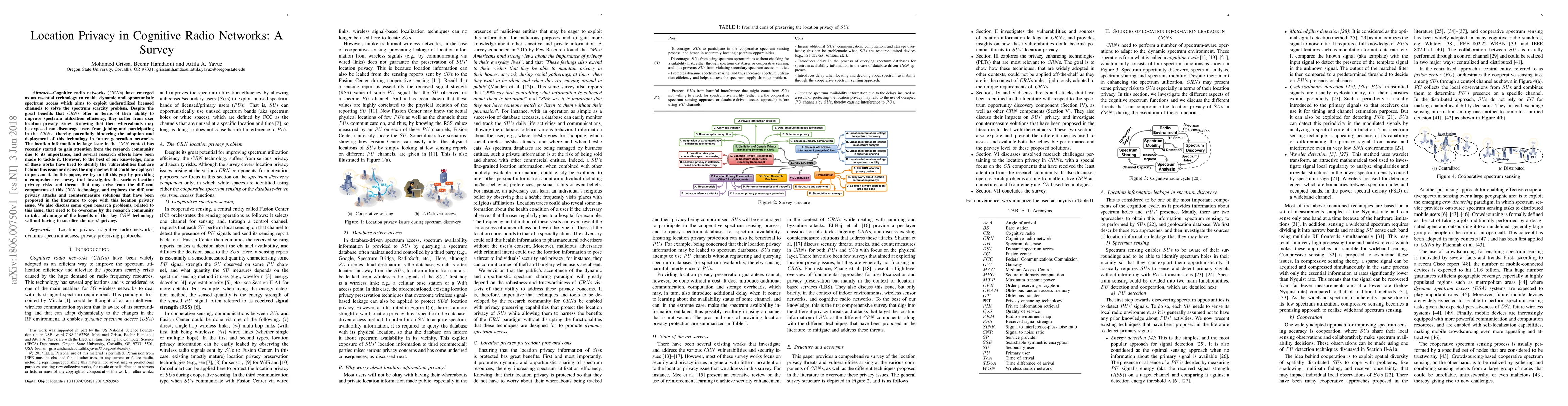 This paper surveys location privacy risks in cognitive radio networks (CRNs), highlighting vulnerabilities and threats from various components. It explores proposed privacy attacks and countermeasures, and identifies open research issues to balance CRN benefits with user privacy.