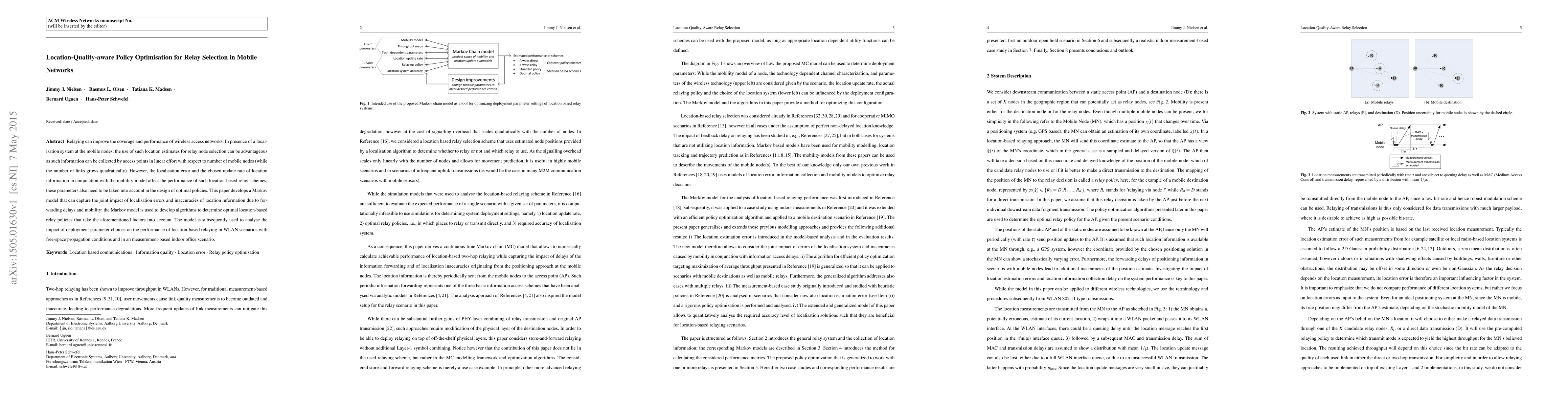 This paper develops a Markov model for optimal relay selection in mobile networks, considering location-quality and localisation errors. It proposes algorithms to determine location-based relay policies that account for localisation inaccuracies and mobility, and analyses their performance in WLAN and indoor office scenarios.