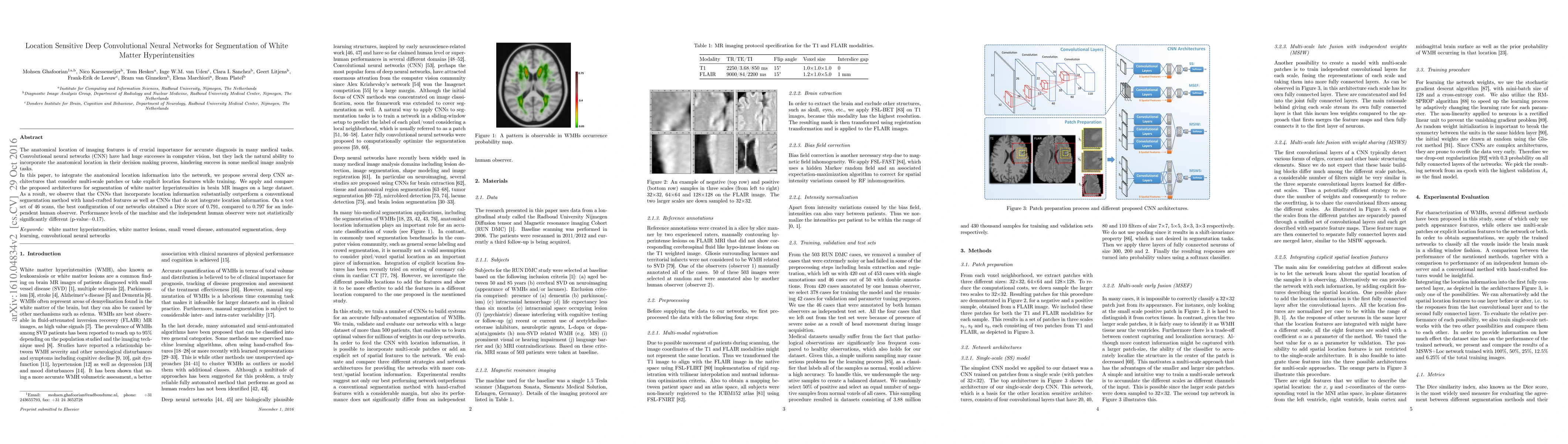 This research proposes deep convolutional neural network (CNN) architectures that incorporate anatomical location information to improve the segmentation of white matter hyperintensities in brain MRI images. The study demonstrates that these location-aware CNNs outperform conventional methods, achieving a Dice score of 0.791 on a test set, which is comparable to a human observer's performance.