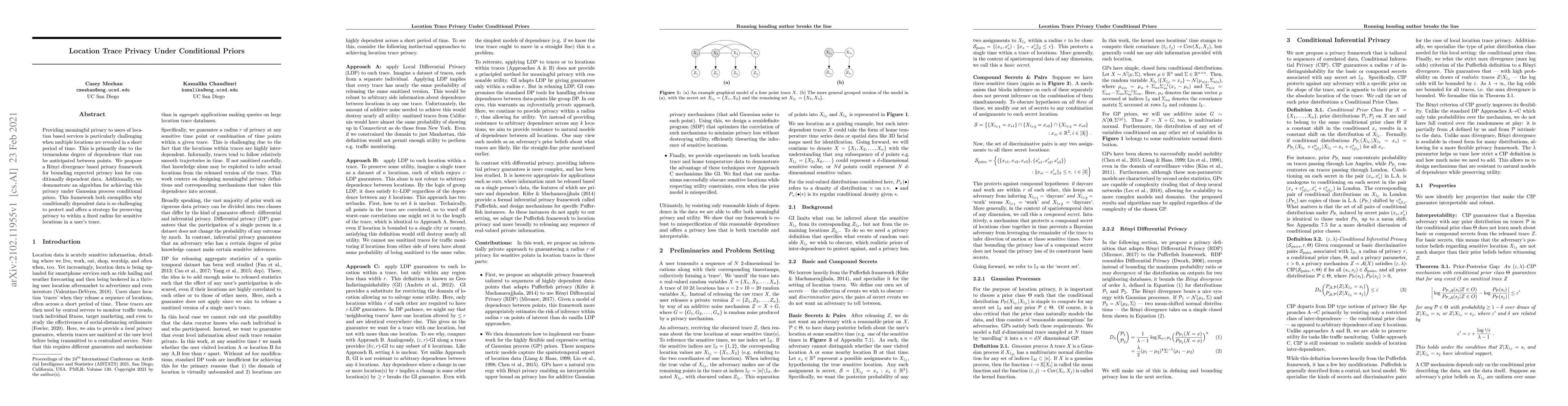 Providing meaningful privacy to users of location based services is particularly challenging when multiple locations are revealed in a short period of time. This is primarily due to the tremendous degree of dependence that can be anticipated between points. We propose a R\'enyi divergence based privacy framework for bounding expected privacy loss for conditionally dependent data. Additionally, we demonstrate an algorithm for achieving this privacy under Gaussian process conditional priors. This framework both exemplifies why conditionally dependent data is so challenging to protect and offers a strategy for preserving privacy to within a fixed radius for sensitive locations in a user's trace.