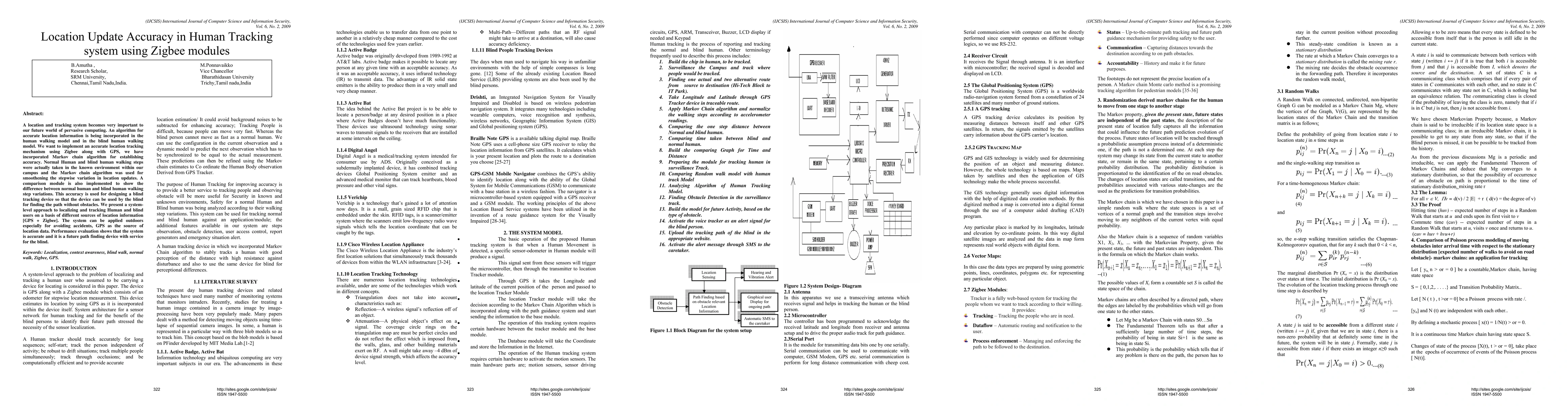 A location and tracking system becomes very important to our future world of pervasive computing. An algorithm for accurate location information is being incorporated in the human walking model and in the blind human walking model. We want to implement an accurate location tracking mechanism using Zigbee along with GPS, we have incorporated Markov chain algorithm for establishing accuracy. Normal Human and blind human walking steps were actually taken in the known environment within our campus and the Markov chain algorithm was used for smoothening the stepwise variation in location updates. A comparison module is also implemented to show the difference between normal human and blind human walking step variations. This accuracy is used for designing a blind tracking device so that the device can be used by the blind for finding the path without obstacles. We present a system level approach to localizing and tracking Human and blind users on a basis of different sources of location information [GPS plus Zigbee]. The system can be applied outdoors especially for avoiding accidents, GPS as the source of location data. Performance evaluation shows that the system is accurate and it is a future path finding device with service for the blind.